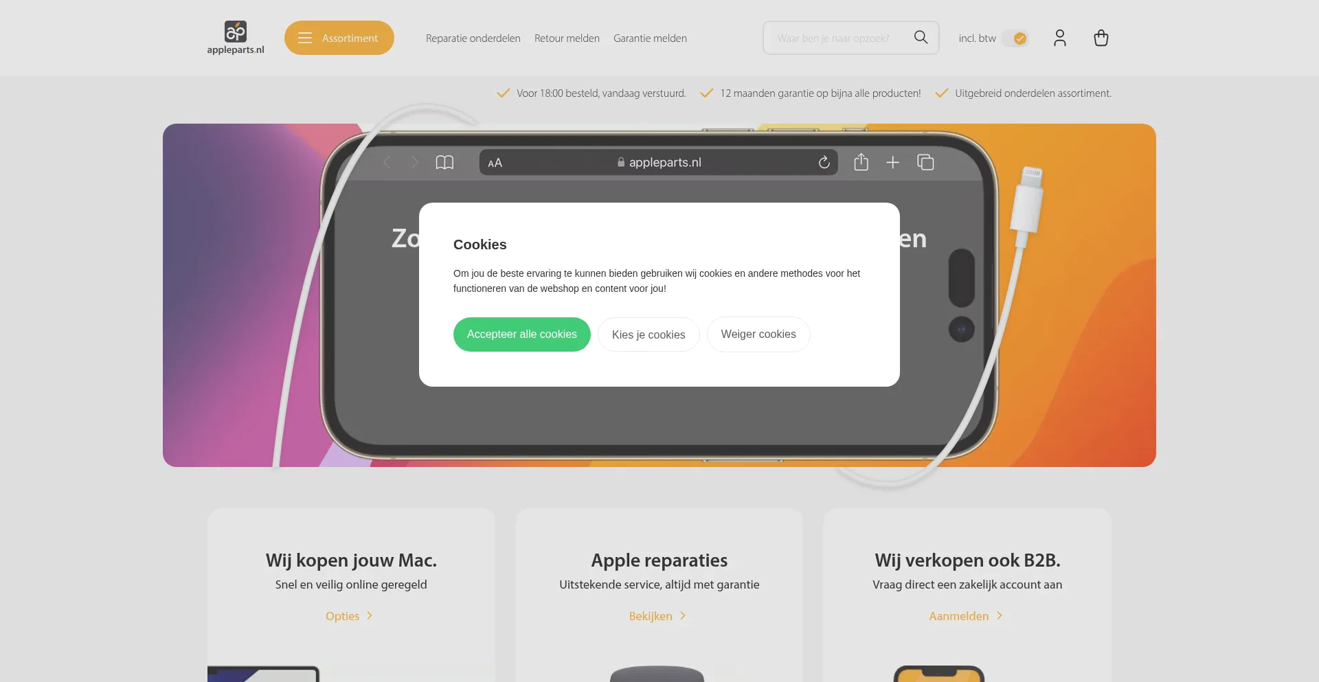 Analysis indicates that appleparts.nl operates as an e-commerce platform facilitating online transactions for goods or services. The website implements shopping cart functionality, payment processing systems, and product catalog features typical of commercial retail operations.