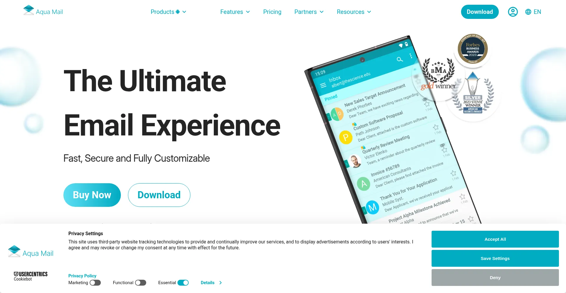 The aqua-mail.com website uses Google Tag Manager to add and update tracking tags on its website.