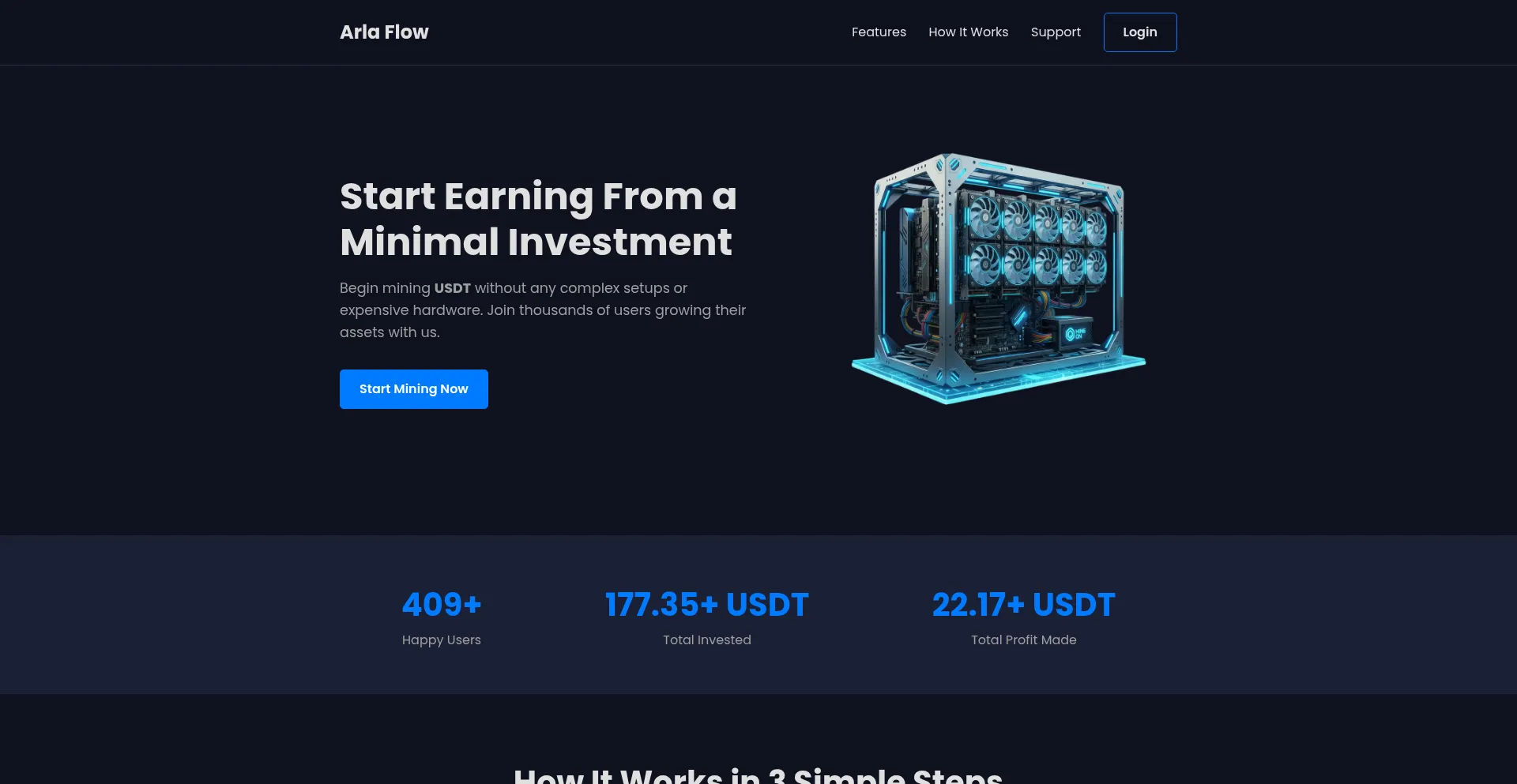 The arlaflow.com probably offers cloud mining services or cryptocurrency mining investments. Some platforms provide legitimate mining rental services, while others may use fake mining dashboards to display virtual earnings that cannot be withdrawn.