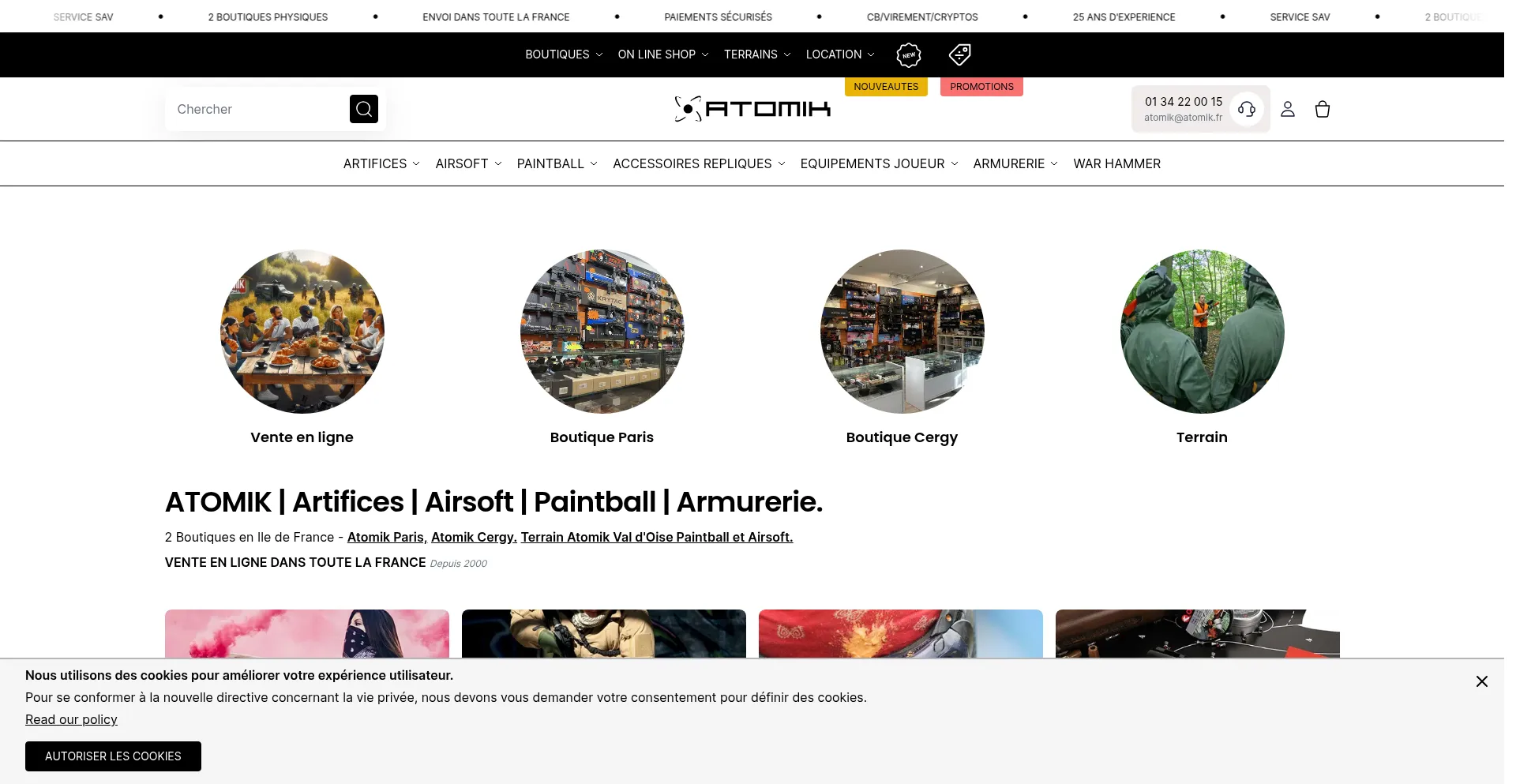 Atomik le partenaire de vos loisirs les plus fous depuis 25 ans, Paintball, Airsoft, Armurerie et Artifices. Boutiques à Paris et Cergy, Terrain Paintball et Airsoft.