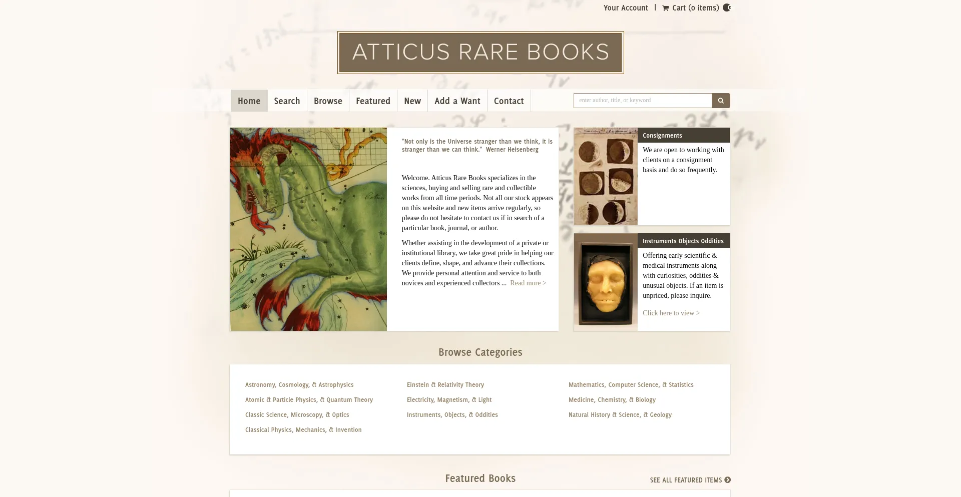 Analysis indicates that atticusrarebooks.com operates as an e-commerce platform facilitating online transactions for goods or services. The website implements shopping cart functionality, payment processing systems, and product catalog features typical of commercial retail operations.