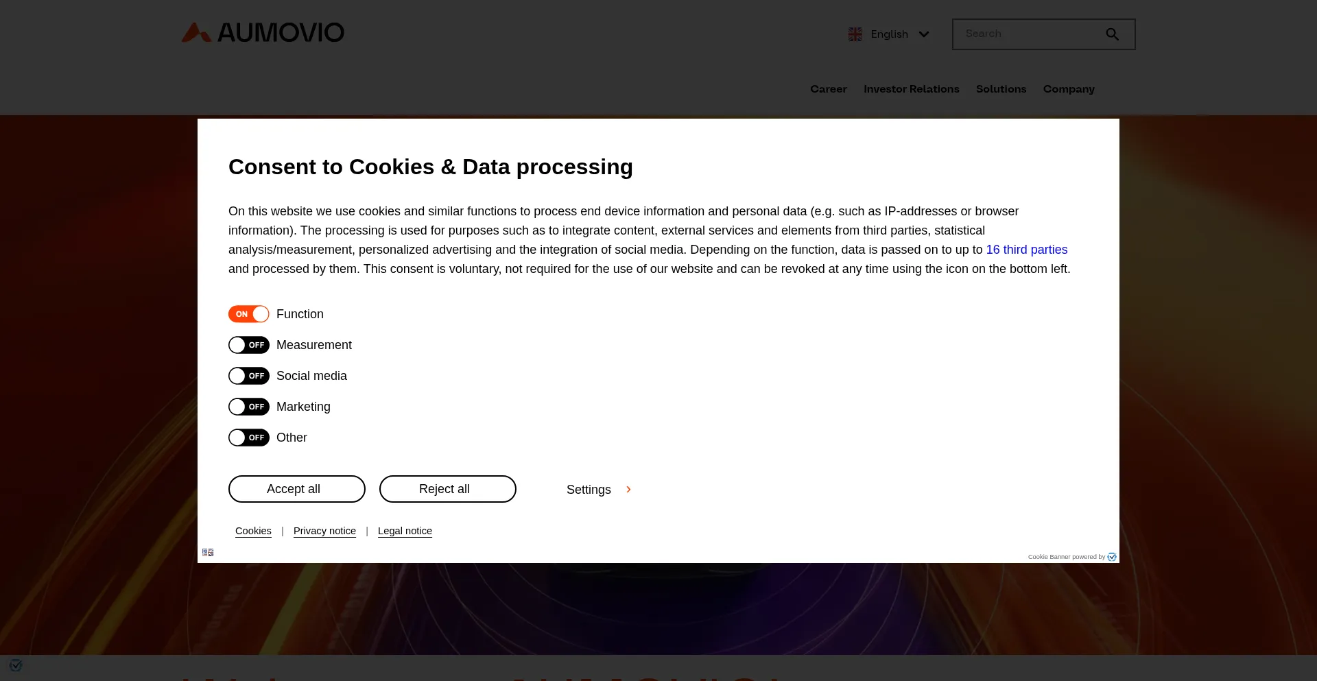 The website implements cookie consent mechanisms in compliance with privacy regulations such as GDPR or CCPA. This demonstrates that aumovio.com adheres to data protection standards and provides users with control over personal data collection practices.