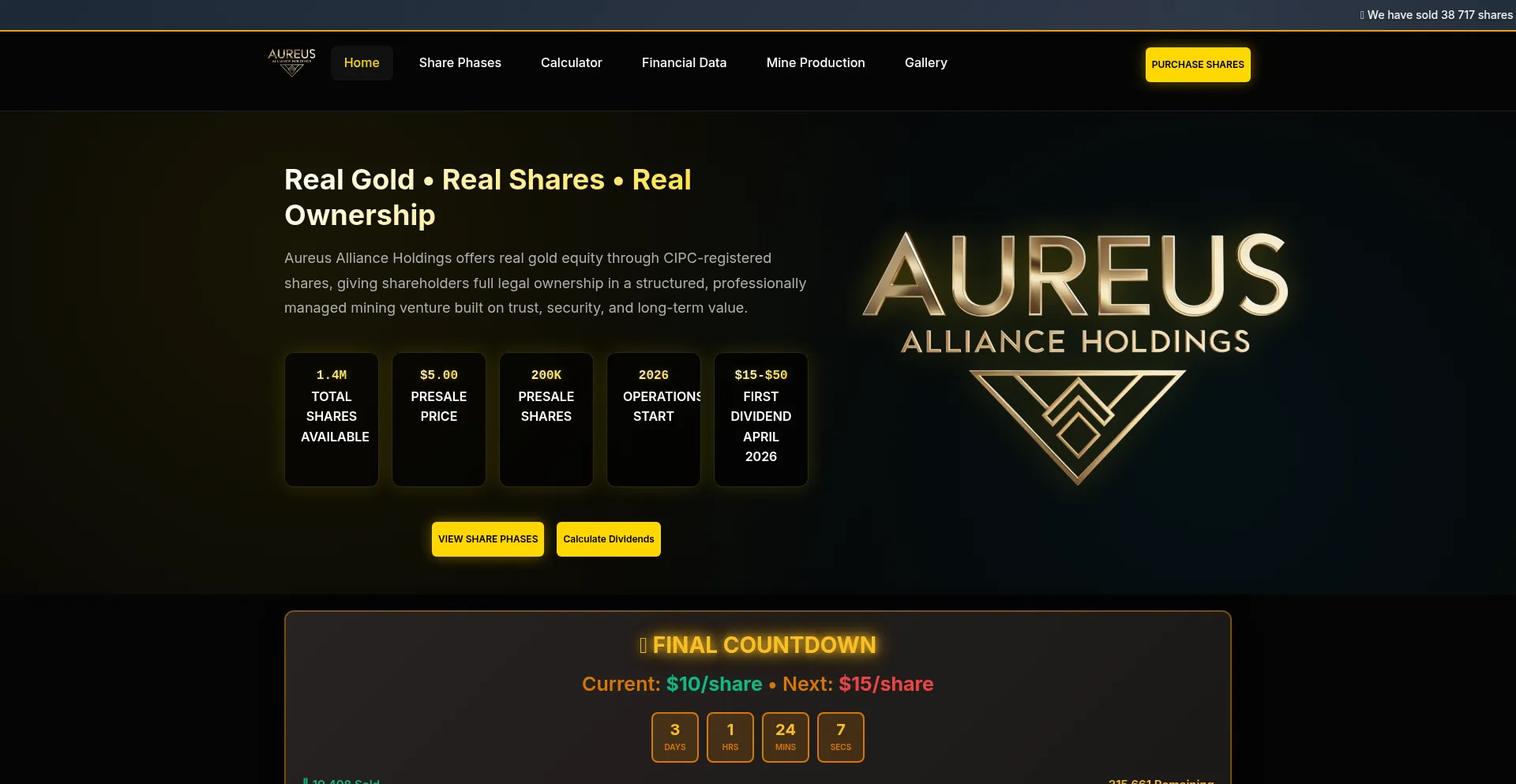 Purchase shares in Aureus Alliance Holdings, a South African gold mining company. Sustainable gold placer deposit mining operations with transparent profit sharing and blockchai...