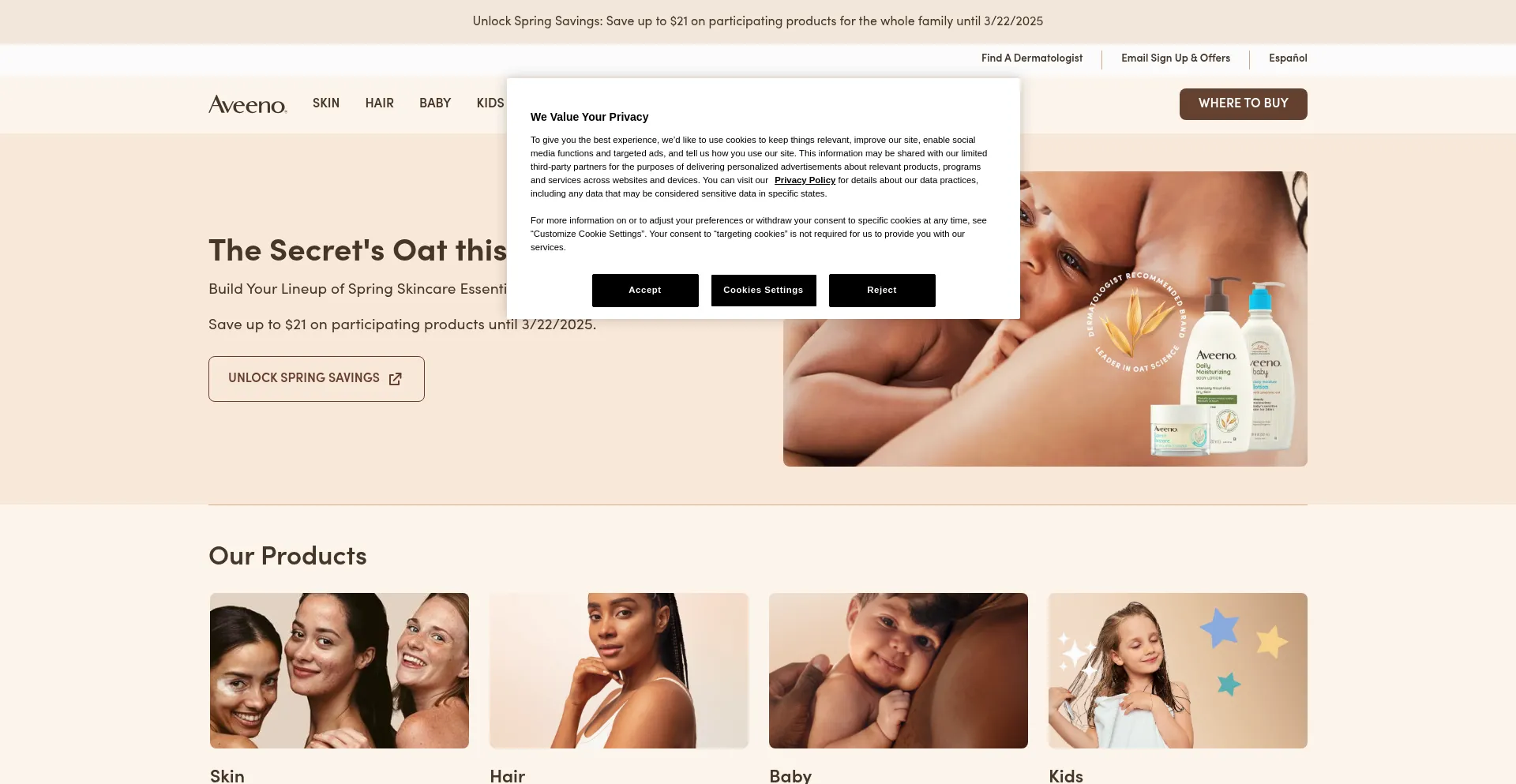 The website implements cookie consent mechanisms in compliance with privacy regulations such as GDPR or CCPA. This demonstrates that aveeno.com adheres to data protection standards and provides users with control over personal data collection practices.