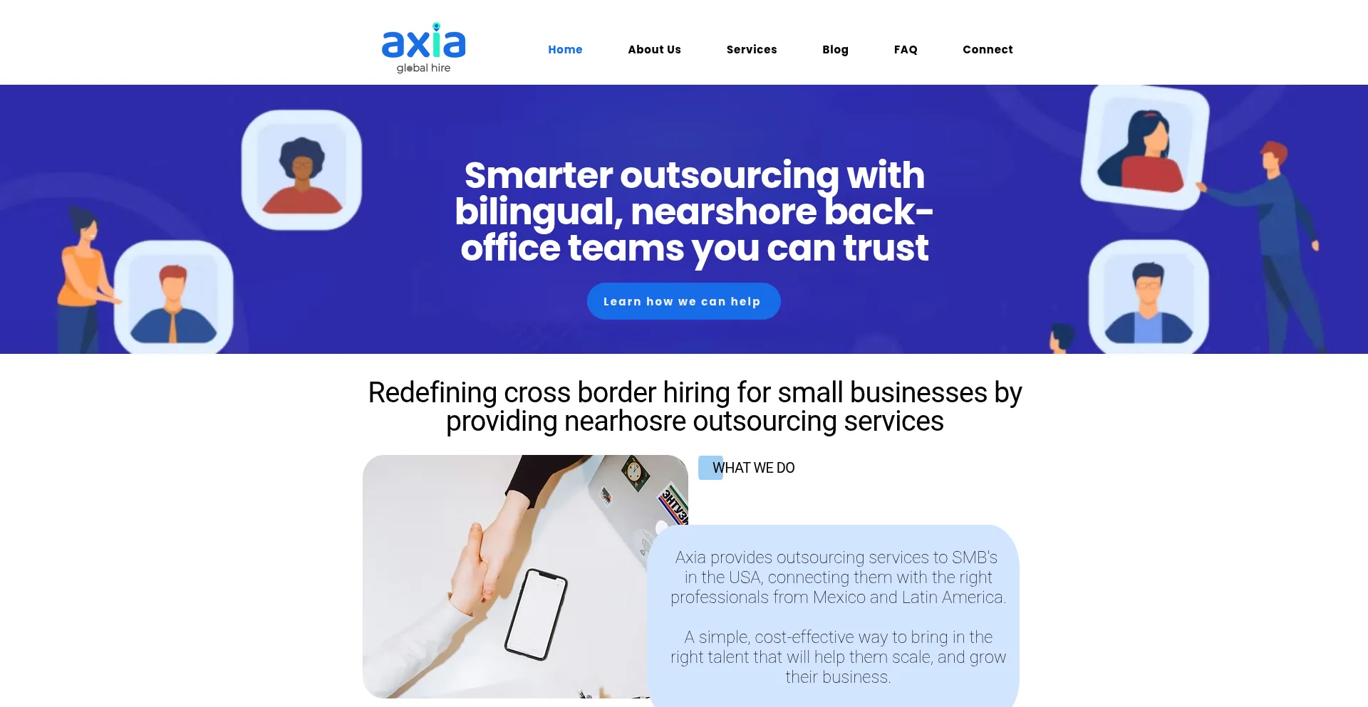 We provide outsourcing services for U.S. small businesses—connecting them with highly vetted nearshore professionals. Ready to hire smarter? Contact us! | Axia Global Hire