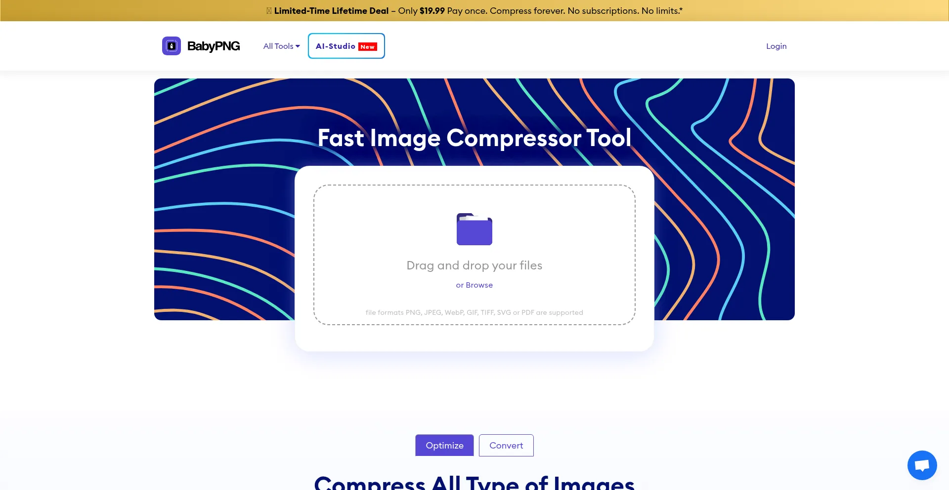 Efficiently compress PNG, JPEG, WebP, GIF, TIFF, SVG, and PDF files with BabyPNG. Enjoy fast, free, high-quality online compression to optimize your visuals.