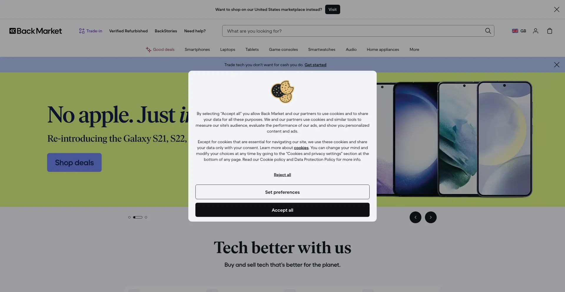 The backmarket.co.uk website uses Google Tag Manager to add and update tracking tags on its website.