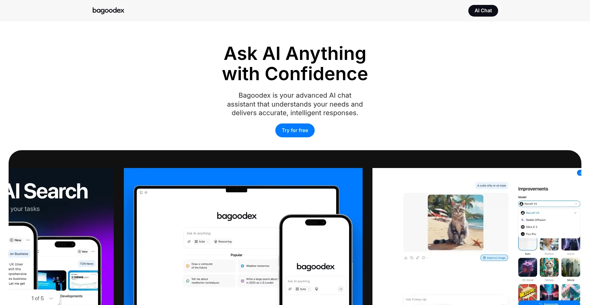 Ask AI using Bagoodex. Our AI chat bot and AI chat generator lets you search, write, and create images instantly. Experience fast, flexible, and intelligent AI chat today.