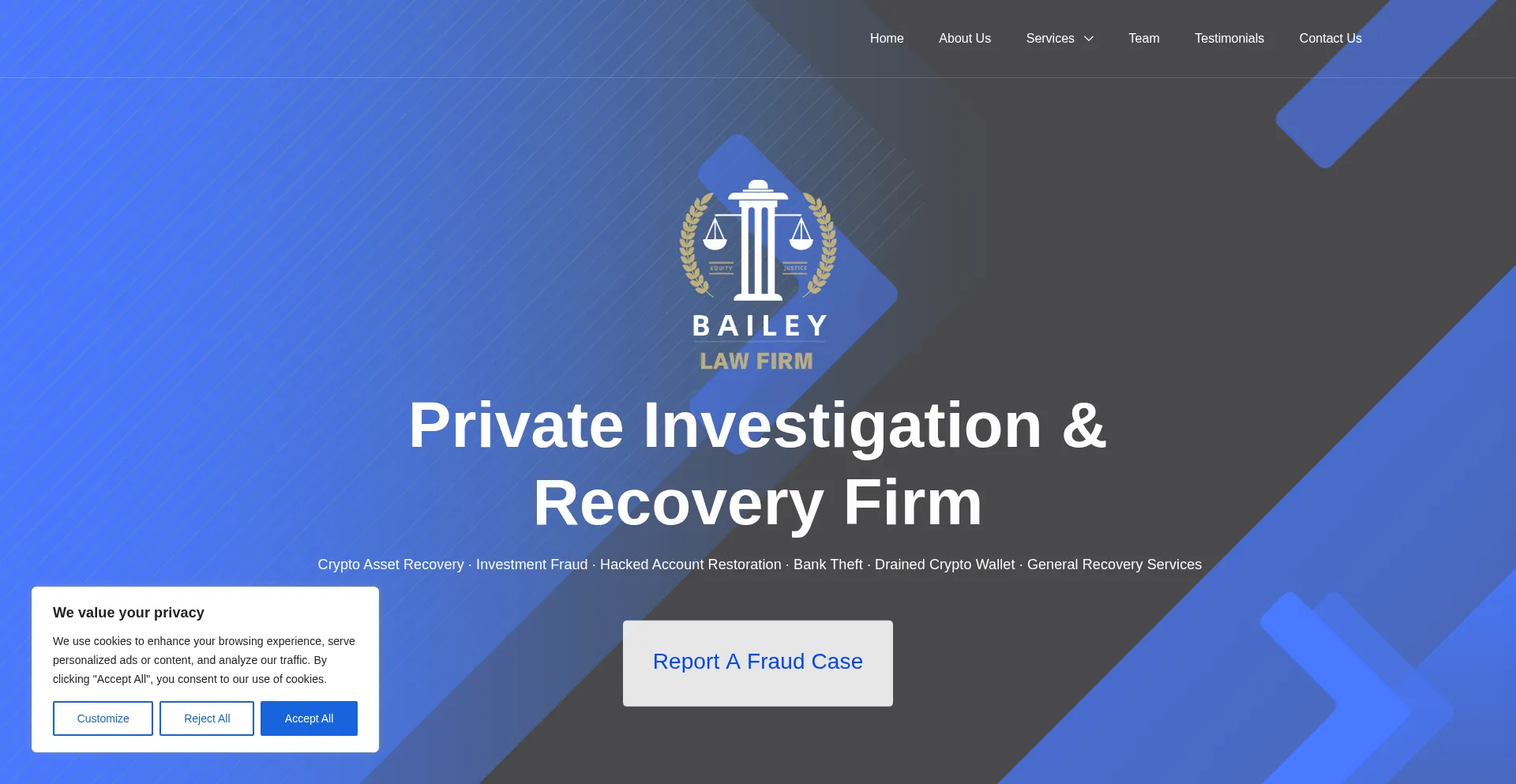 The website baileyslawfirm.online advertises fund recovery services for lost or stolen assets. While some operate on contingency fee structures, others may require upfront payments, which can indicate fraudulent operations. Verify credentials and regulatory compliance before engaging such services.