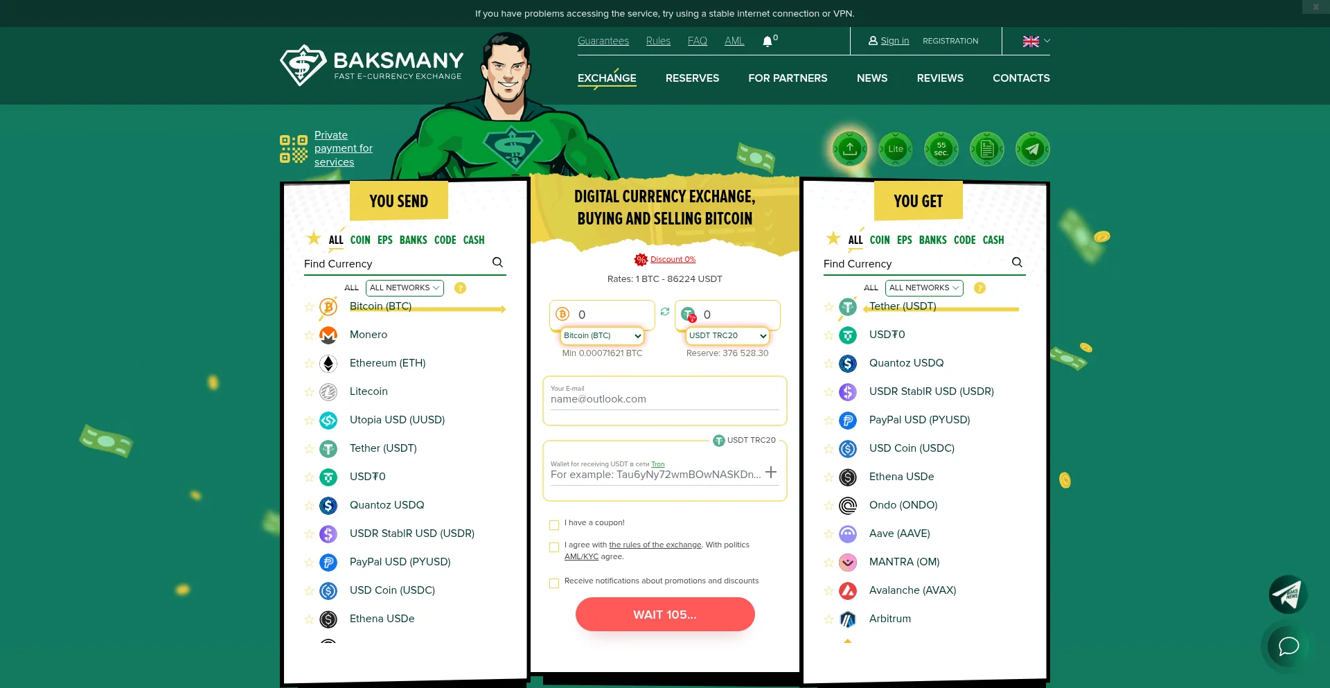 The purchase and sale of bitcoin, as well as the bitcoin exchange, offers the Baksmany exchange service. The exchanger is provided with large reserves and provides a high speed ...