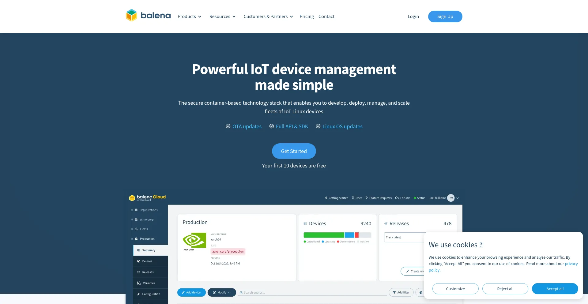 balenaCloud: Manage fleets of IoT Linux devices with balena’s cloud platform. First 10 devices are free. Develop, deploy, and scale your IoT fleet.