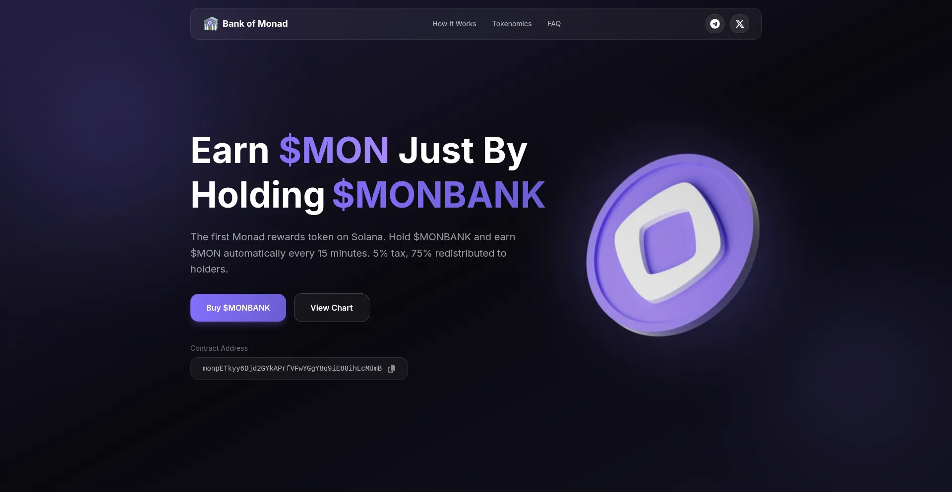 The first Monad rewards token on Solana. Hold $MONBANK and earn $MON automatically every 15 minutes. 5% tax, 75% redistributed to holders.
