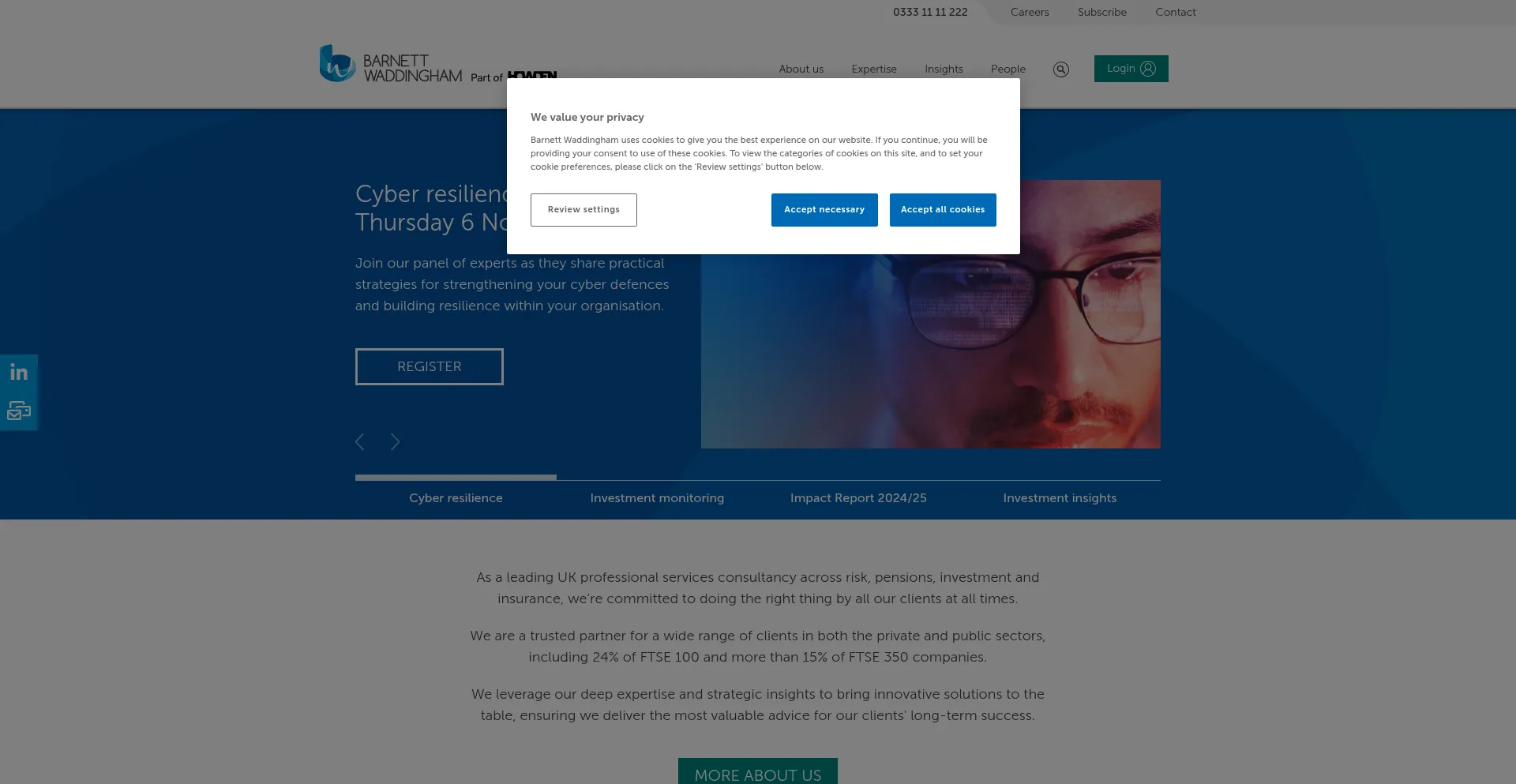 The website implements cookie consent mechanisms in compliance with privacy regulations such as GDPR or CCPA. This demonstrates that barnett-waddingham.co.uk adheres to data protection standards and provides users with control over personal data collection practices.