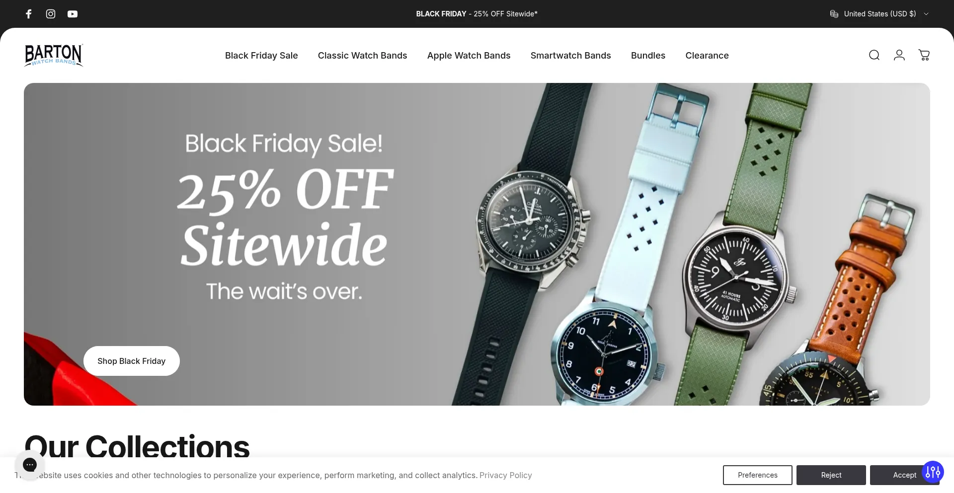 Our analyzer determines that website bartonwatchbands.com is using Shopify CMS. Shopify is a popular e-commerce platform, powering around 4.4% of websites globally.