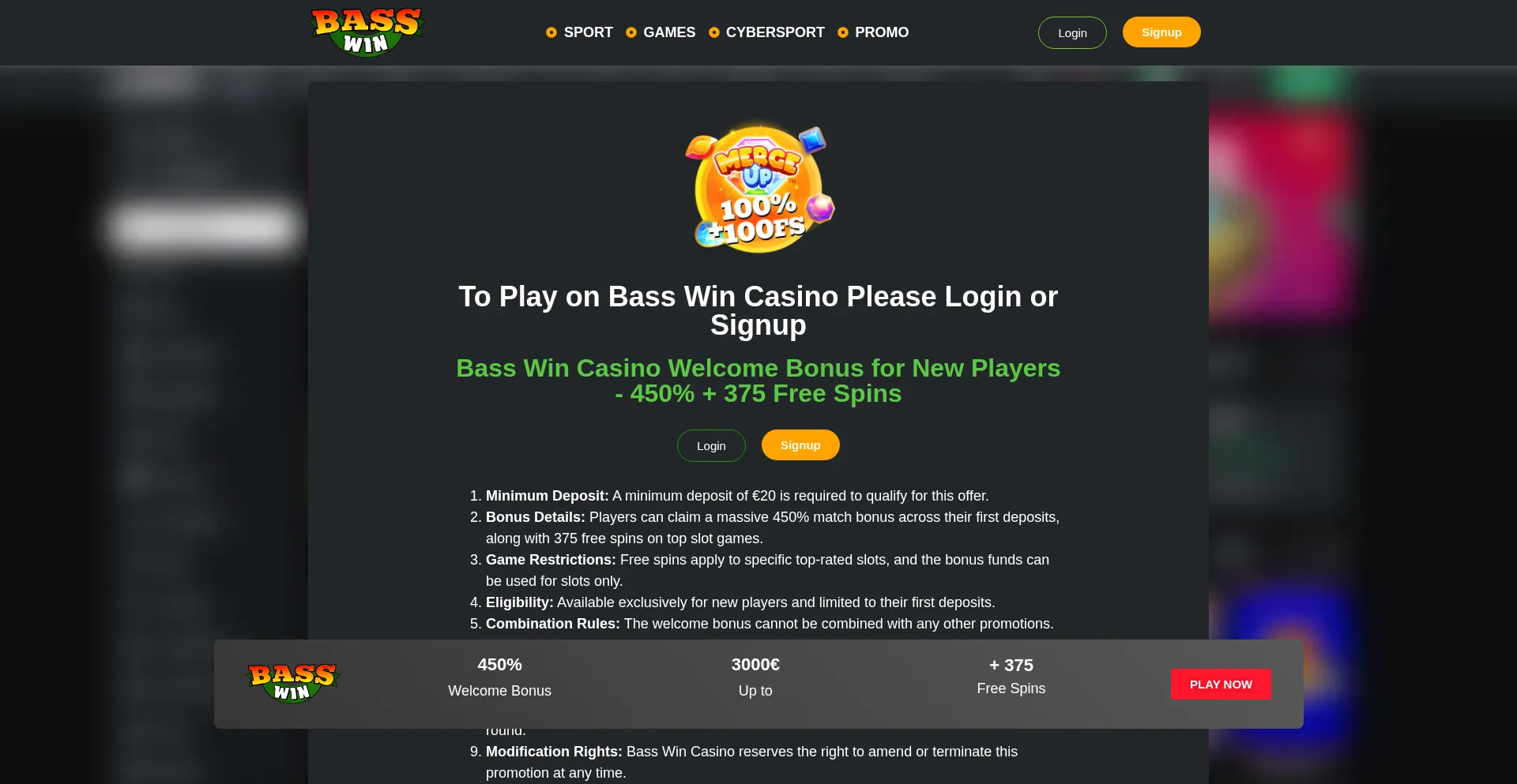 Bass Win Casino for an exciting welcome offer: Get your first deposit 100% + 100Free spins in merge up ! Sign up for more bonuses!