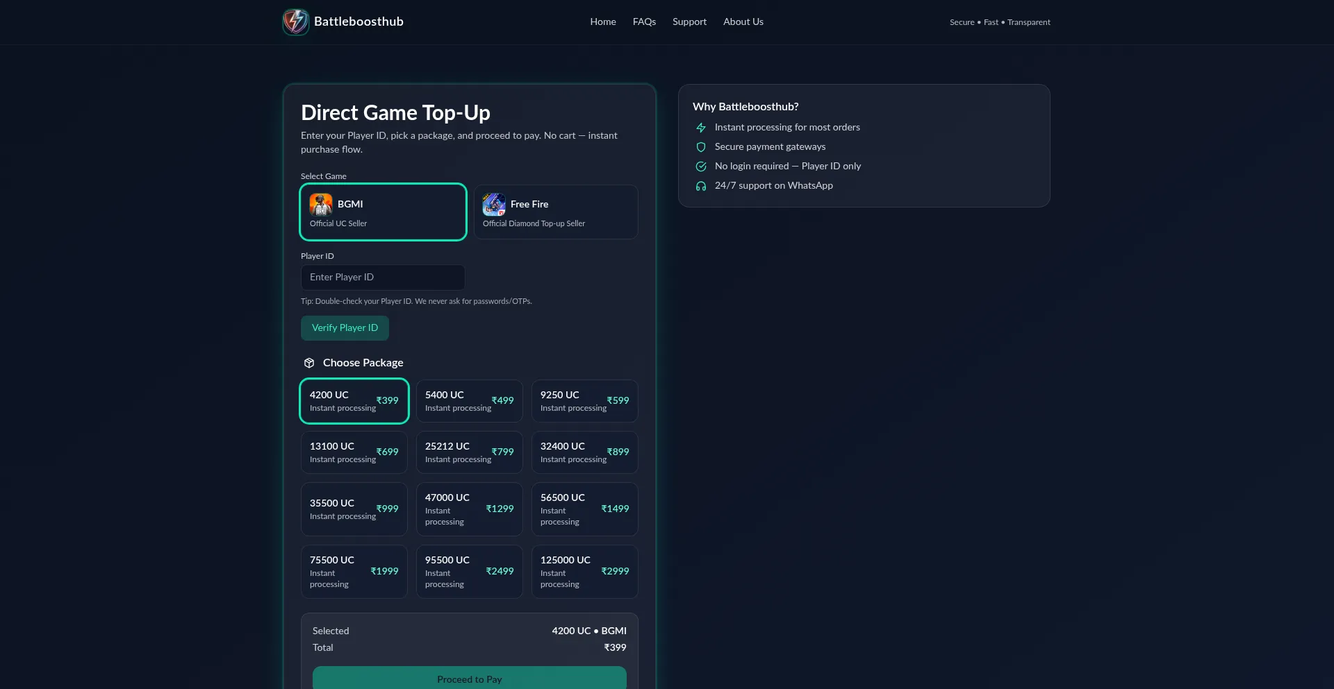 Buy BGMI UC, Free Fire MAX Diamonds, COD Points more instantly at Battleboosthub — your trusted official reseller. No registration or login required. Fast delivery, 24×7 supp...