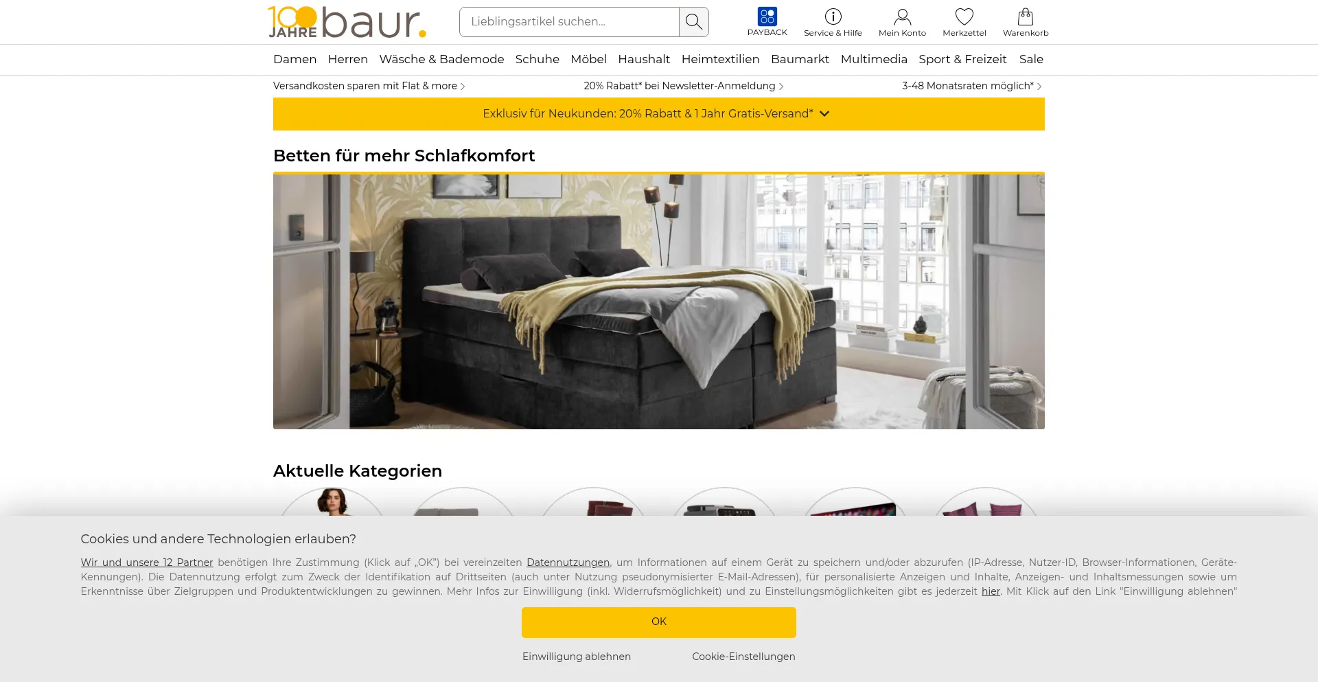 The website implements cookie consent mechanisms in compliance with privacy regulations such as GDPR or CCPA. This demonstrates that baur.de adheres to data protection standards and provides users with control over personal data collection practices.