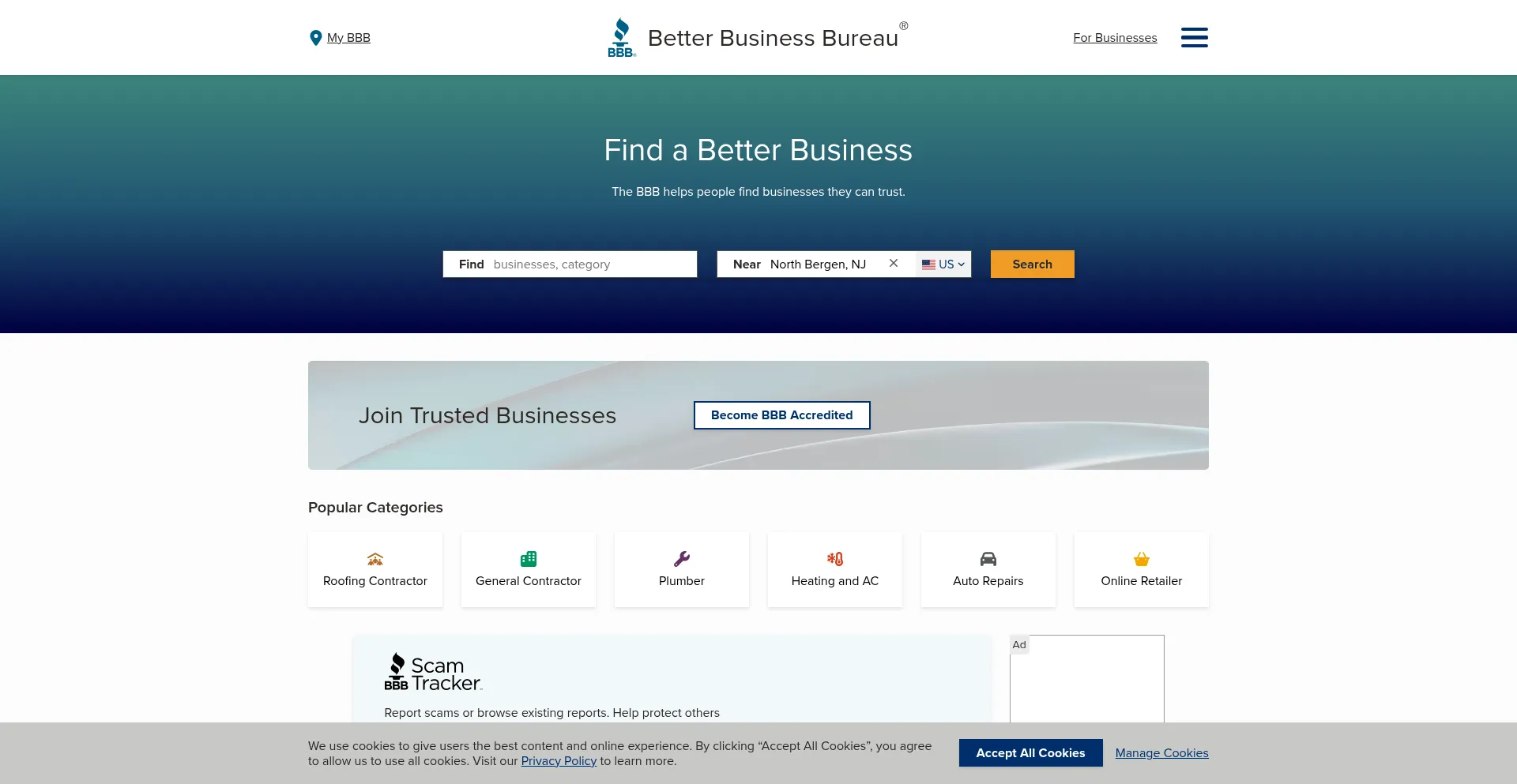 The website implements cookie consent mechanisms in compliance with privacy regulations such as GDPR or CCPA. This demonstrates that bbb.com adheres to data protection standards and provides users with control over personal data collection practices.