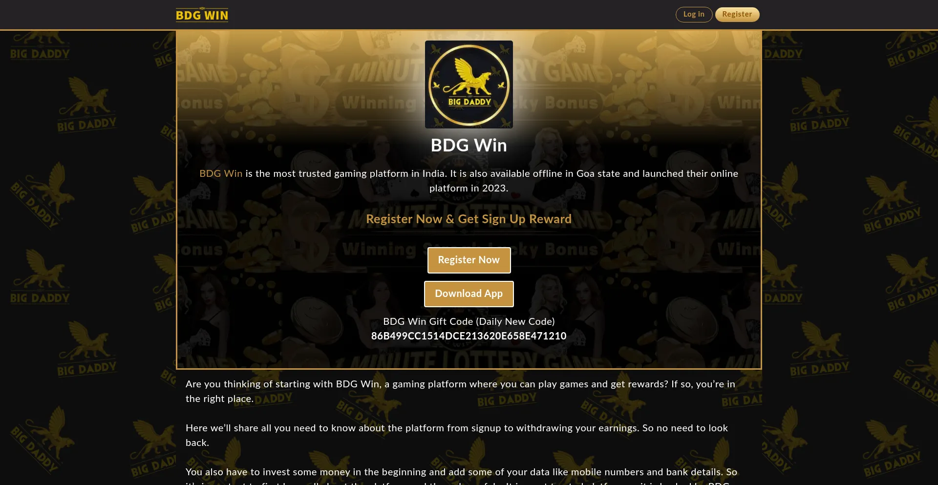 BDG Win Game is India's most trusted platform. It is backed by BDG Game i.e also know as Big Daddy Game. So, Sign Up now and get new user bonus.