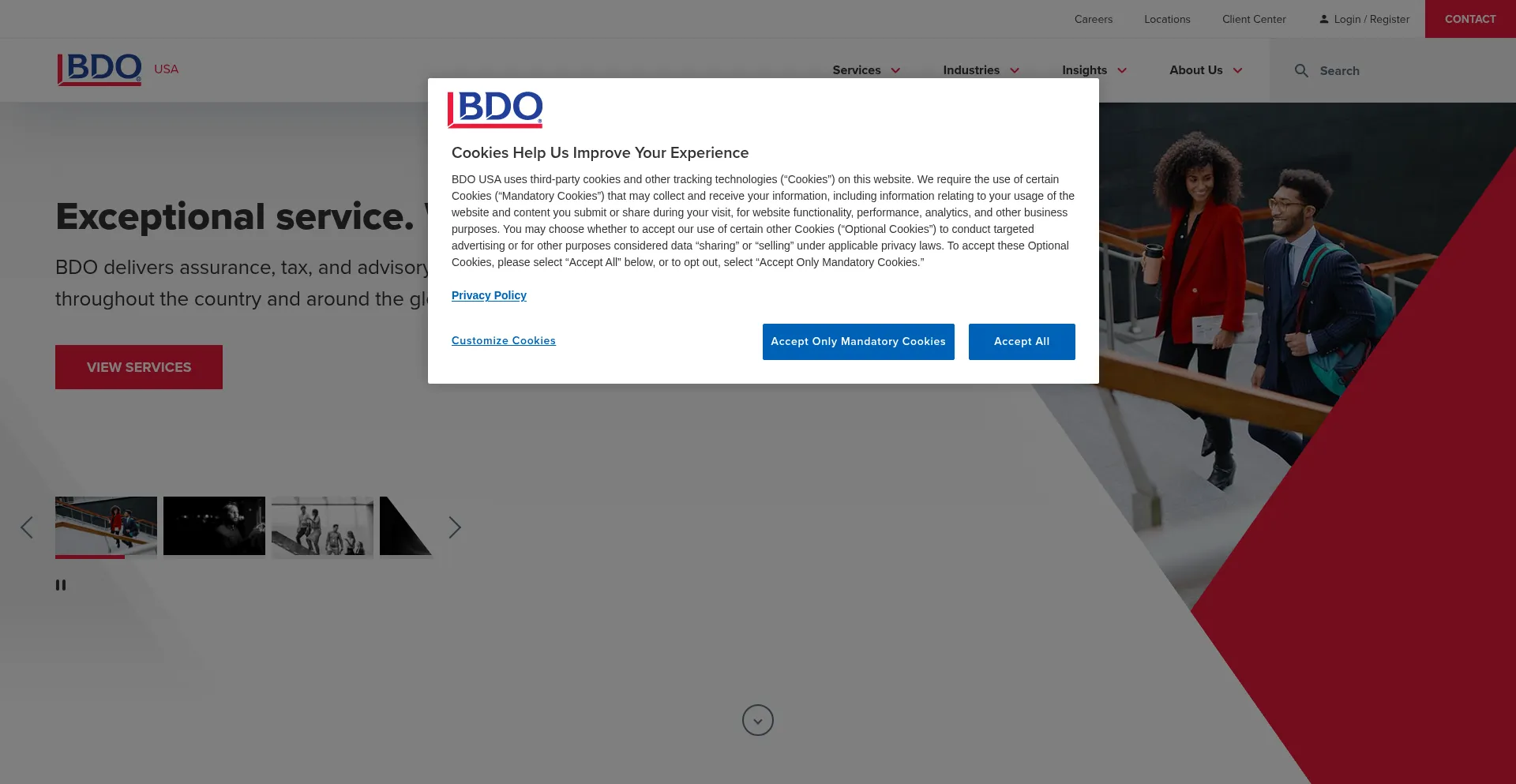 The website implements cookie consent mechanisms in compliance with privacy regulations such as GDPR or CCPA. This demonstrates that bdo.com adheres to data protection standards and provides users with control over personal data collection practices.