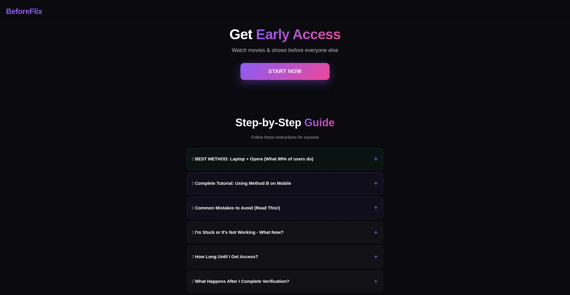 The beforeflix.com website exhibits strong similarities to known phishing operations designed to impersonate trusted entities and steal user credentials, payment information, or personal data. Exercise extreme caution when interacting with beforeflix.com and avoid entering sensitive information.