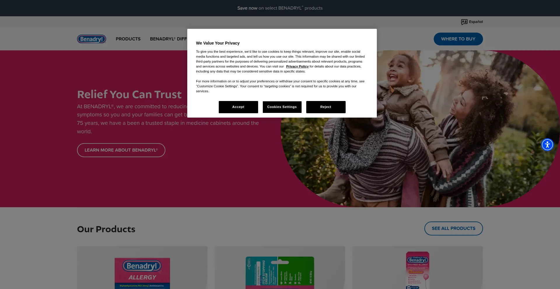 The website implements cookie consent mechanisms in compliance with privacy regulations such as GDPR or CCPA. This demonstrates that benadryl.com adheres to data protection standards and provides users with control over personal data collection practices.