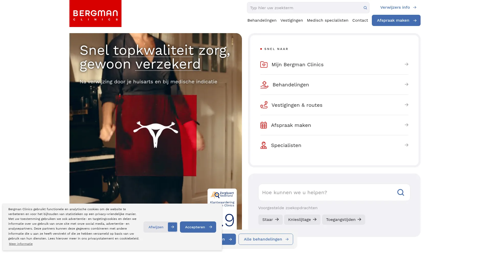 Bij Bergman Clinics kunt u snel terecht voor o.a. behandelingen aan knie en staar. 100% vergoed door uw zorgverzekeraar. ✓ ZorgkaartNL beoordeling ★★★★☆ 8,9