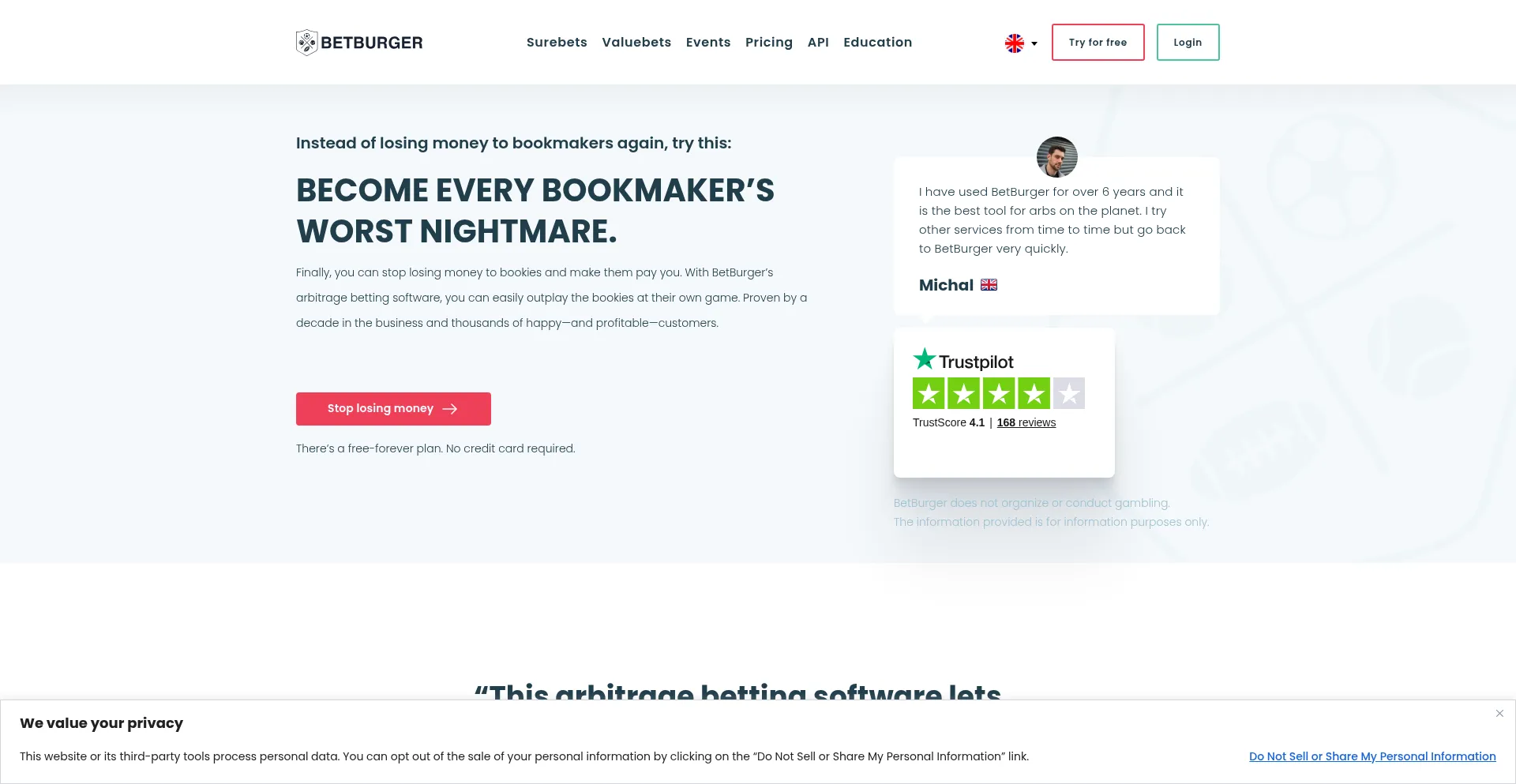 betburger.com has a good Trustpilot score (4.1) based on 168 reviews, indicating a high level of trust from customers. It is a good sign of legitimacy!