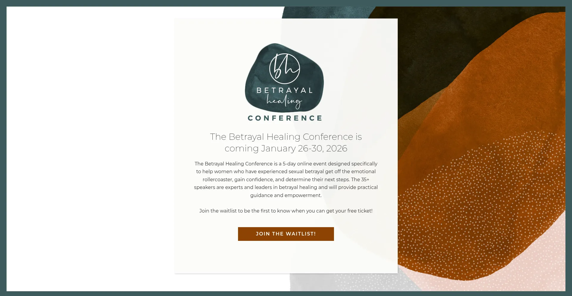 The Betrayal Healing Conference is coming January 22-26, 2024! Join the waitlist to be the first to know when you can get your free ticket and make huge progress in healing afte...