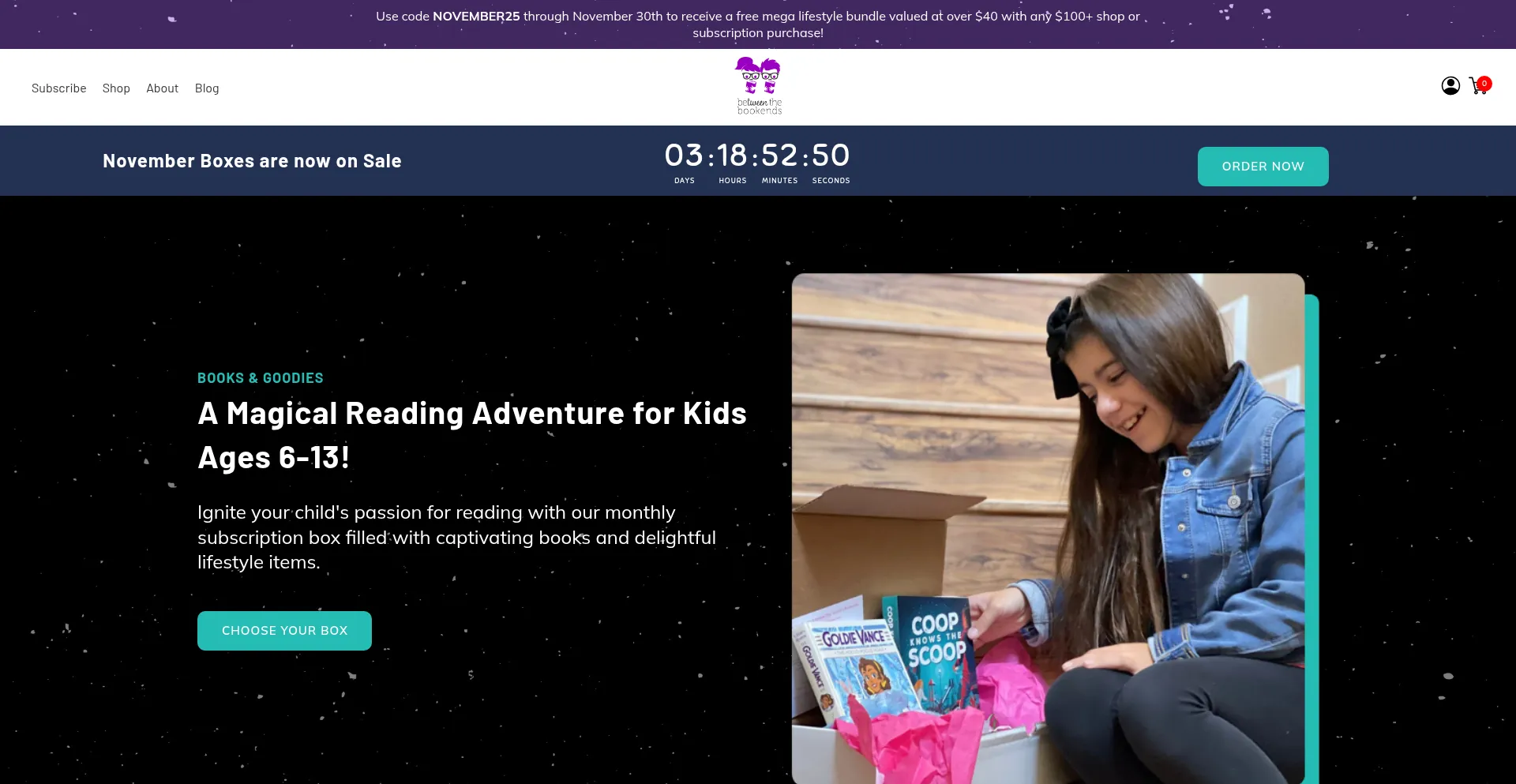 Monthly subscription boxes for kids ages 6-13 with handpicked books and lifestyle items.