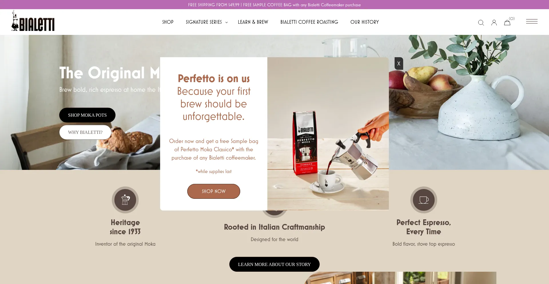 Analysis indicates that bialetti.com operates as an e-commerce platform facilitating online transactions for goods or services. The website implements shopping cart functionality, payment processing systems, and product catalog features typical of commercial retail operations.