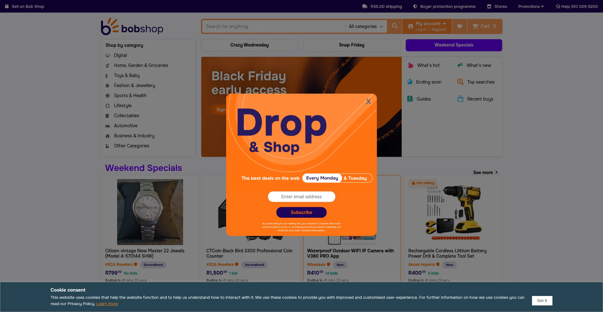 The website implements cookie consent mechanisms in compliance with privacy regulations such as GDPR or CCPA. This demonstrates that bidorbuy.co.za adheres to data protection standards and provides users with control over personal data collection practices.