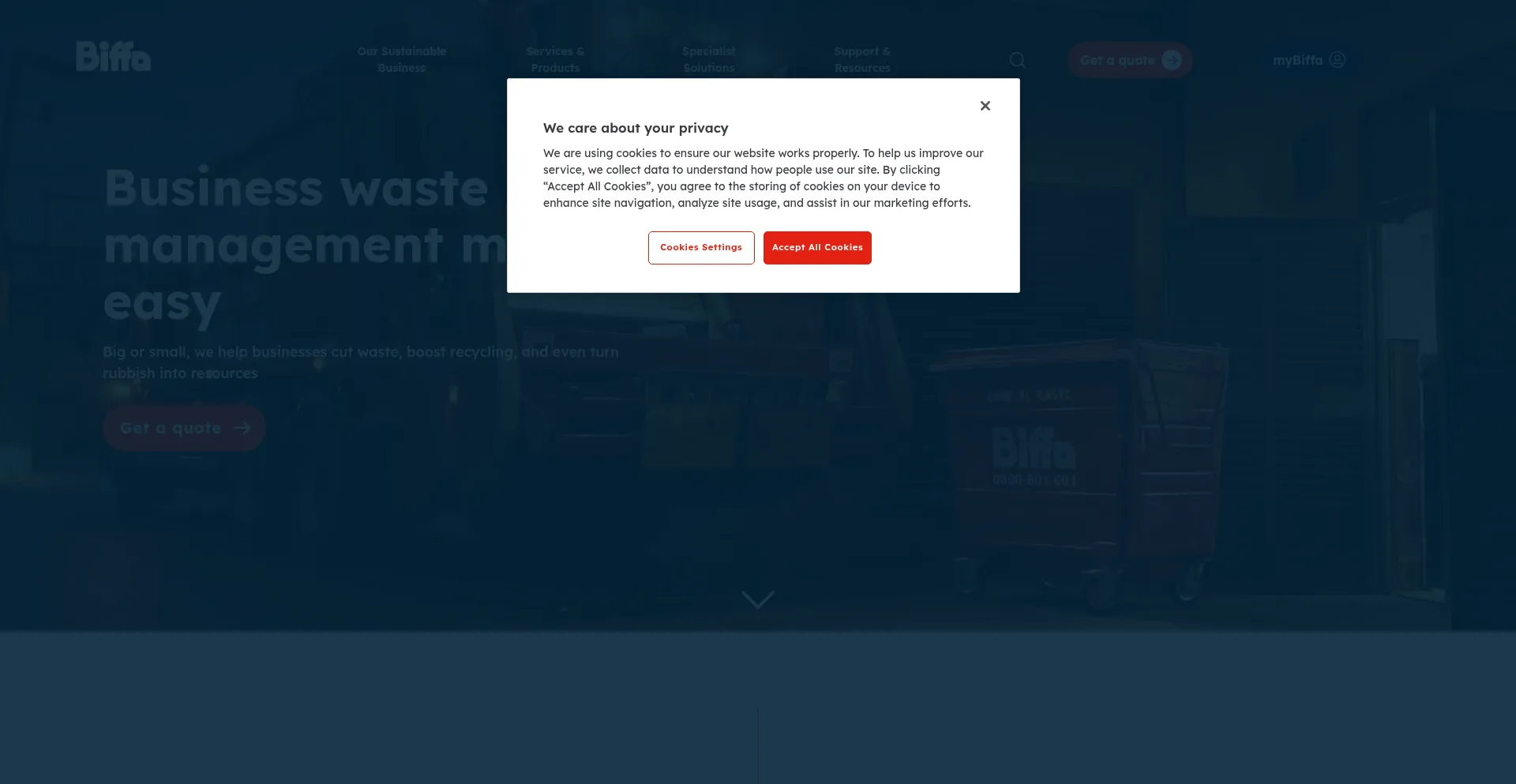 The website implements cookie consent mechanisms in compliance with privacy regulations such as GDPR or CCPA. This demonstrates that biffa.co.uk adheres to data protection standards and provides users with control over personal data collection practices.