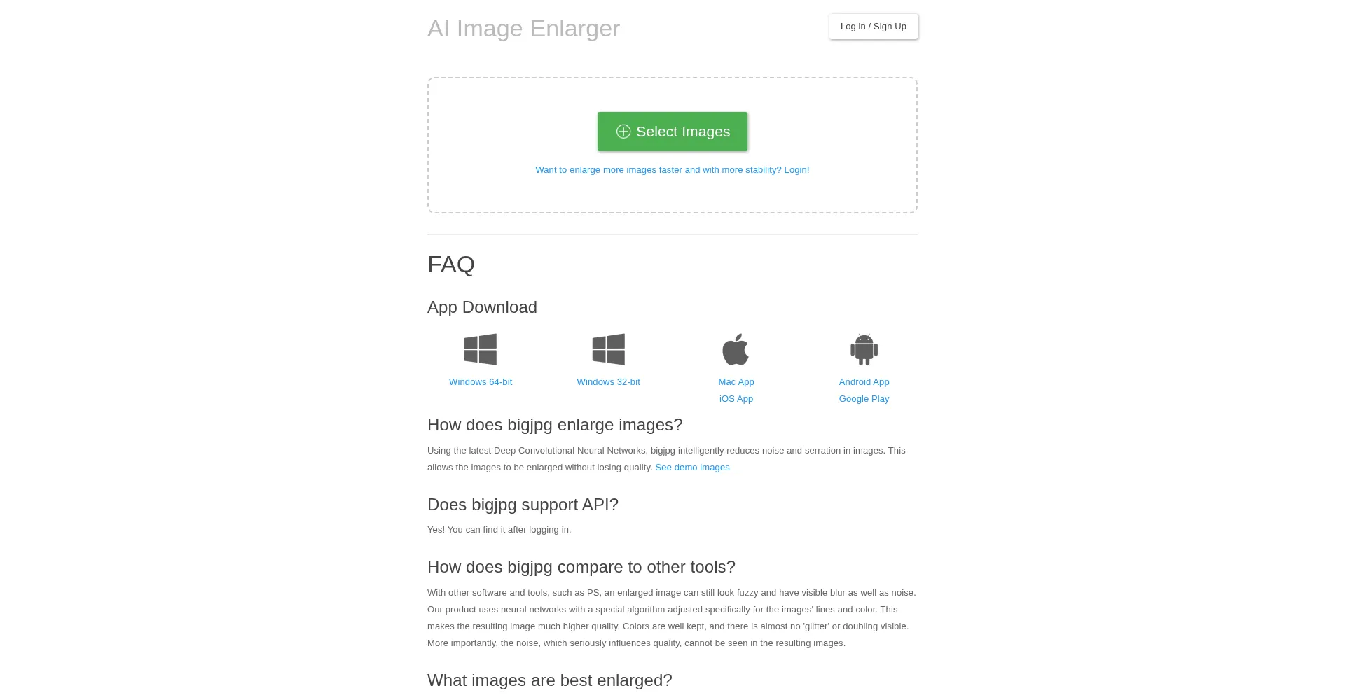 The bigjpg.com website offers a mobile application for Android devices, indicating expanded platform presence beyond web-based services.