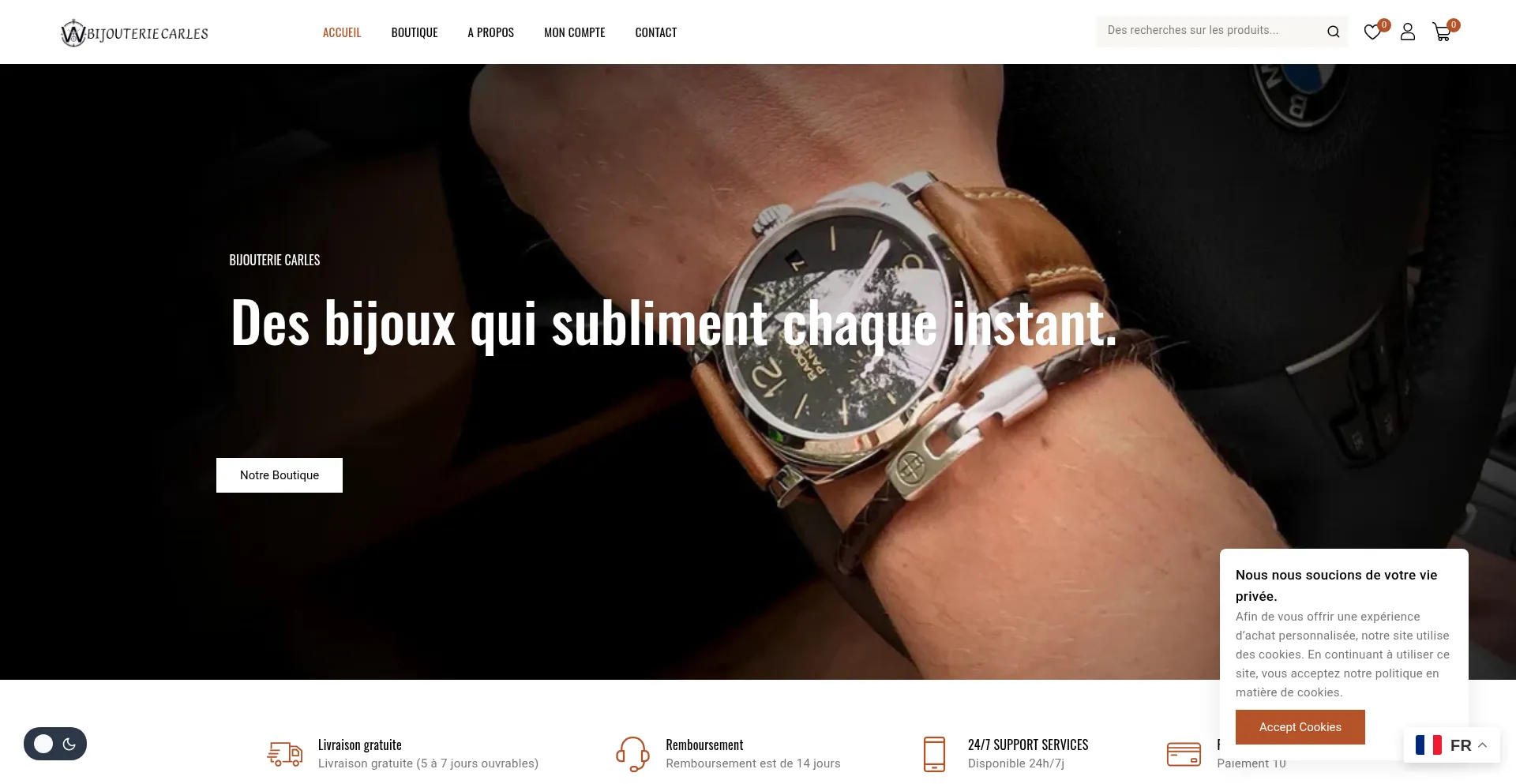Analysis indicates that bijouteriecarles.com operates as an e-commerce platform facilitating online transactions for goods or services. The website implements shopping cart functionality, payment processing systems, and product catalog features typical of commercial retail operations.