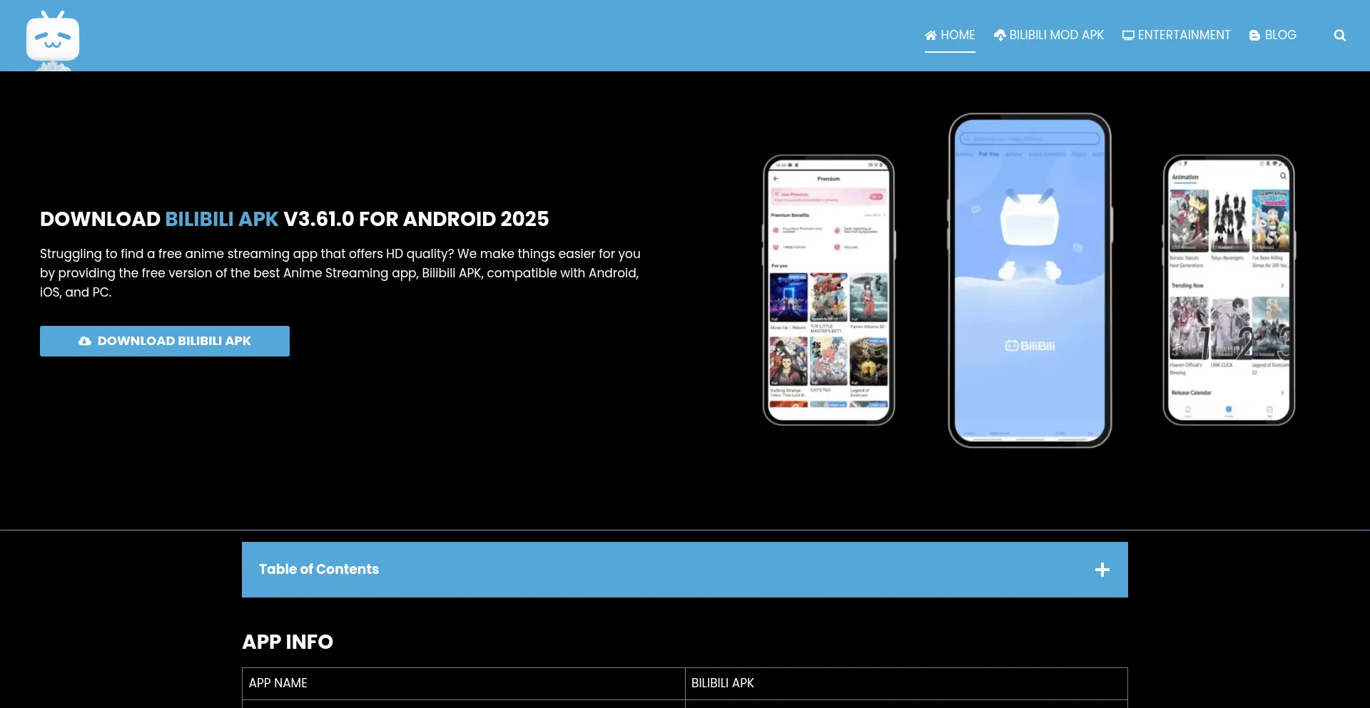 The bilibiliapks.com website offers a mobile application for Android devices, indicating expanded platform presence beyond web-based services.