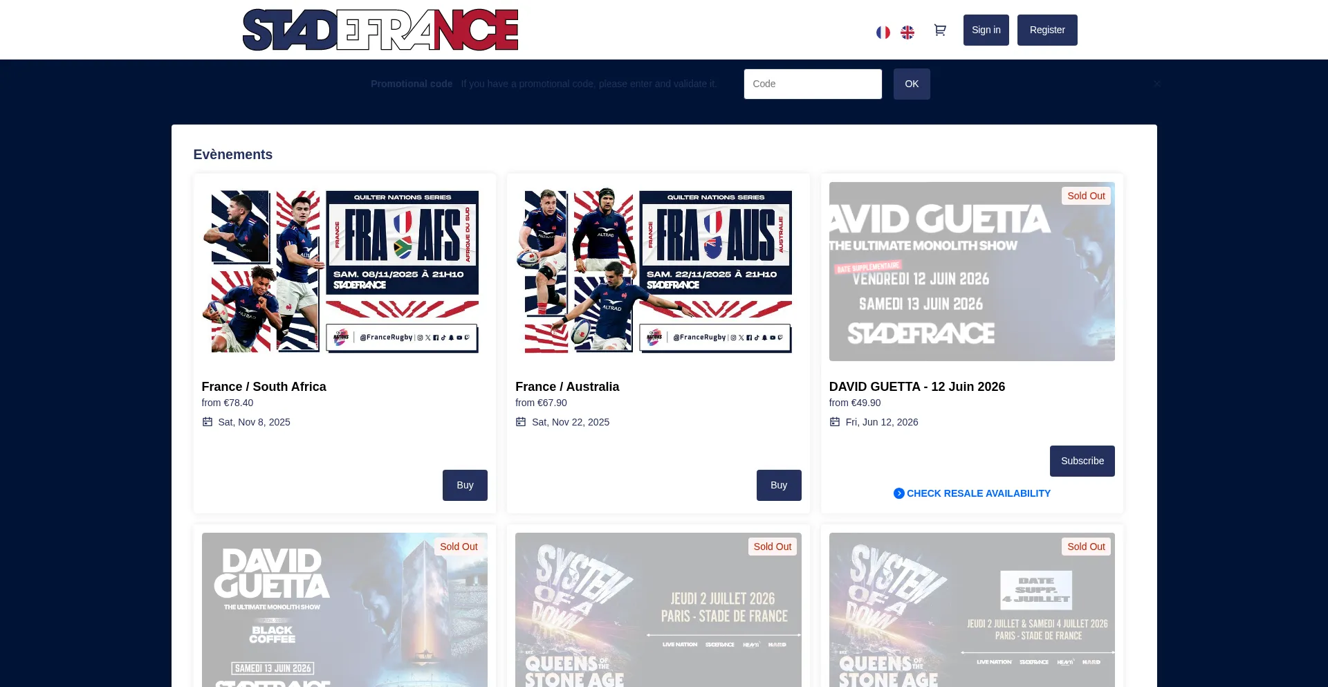 Analysis indicates that billets.stadefrance.com operates as an e-commerce platform facilitating online transactions for goods or services. The website implements shopping cart functionality, payment processing systems, and product catalog features typical of commercial retail operations.