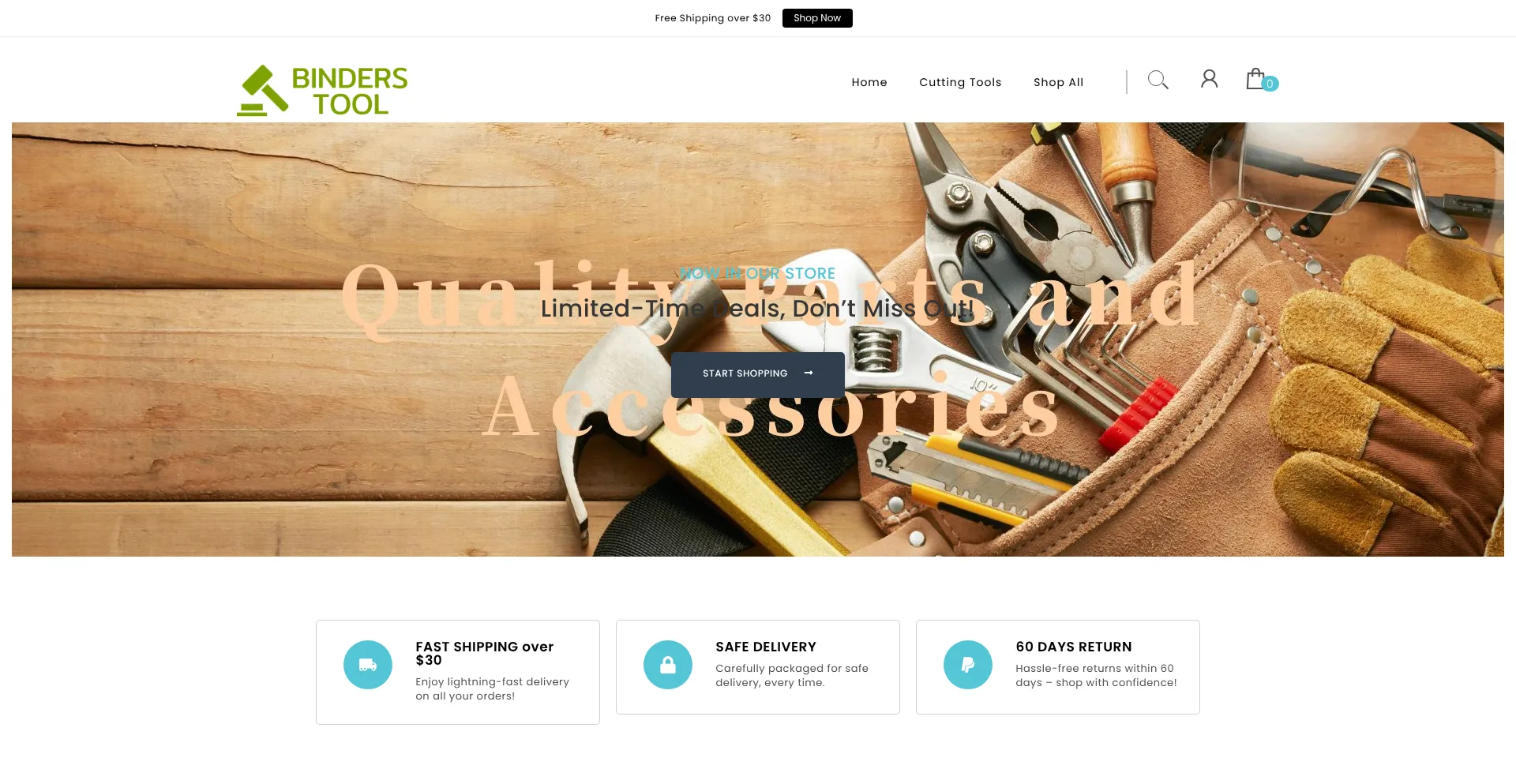 Analysis indicates that binderstool.com operates as an e-commerce platform facilitating online transactions for goods or services. The website implements shopping cart functionality, payment processing systems, and product catalog features typical of commercial retail operations.