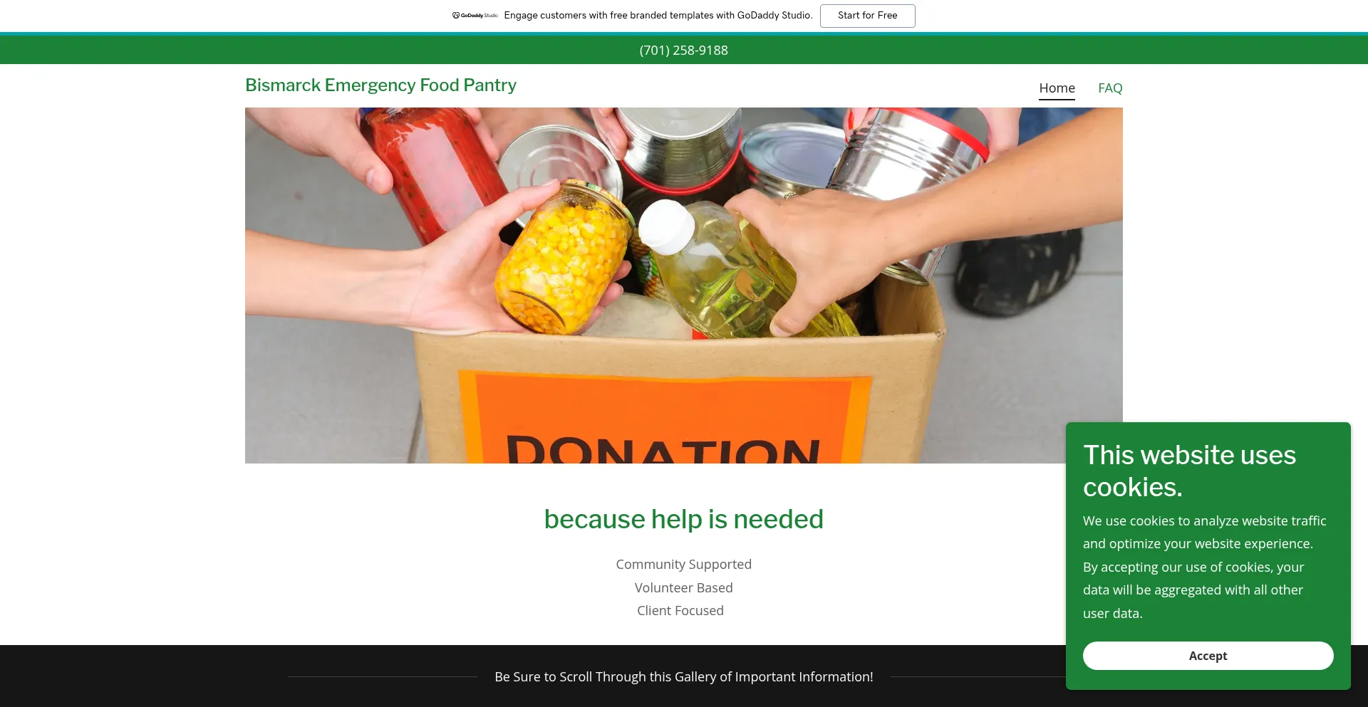 The website implements cookie consent mechanisms in compliance with privacy regulations such as GDPR or CCPA. This demonstrates that bismarckemergencyfoodpantry6.godaddysites.com adheres to data protection standards and provides users with control over personal data collection practices.