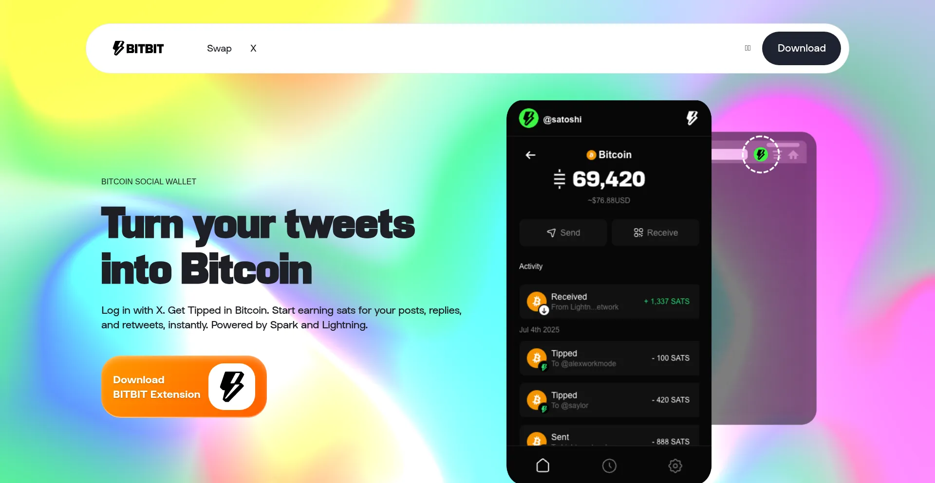 BitBit is a fun, social, and secure Bitcoin wallet for the web. Send and receive sats instantly on X (Twitter), powered by Spark. Native support for Lightning, memecoins (LRC-20...