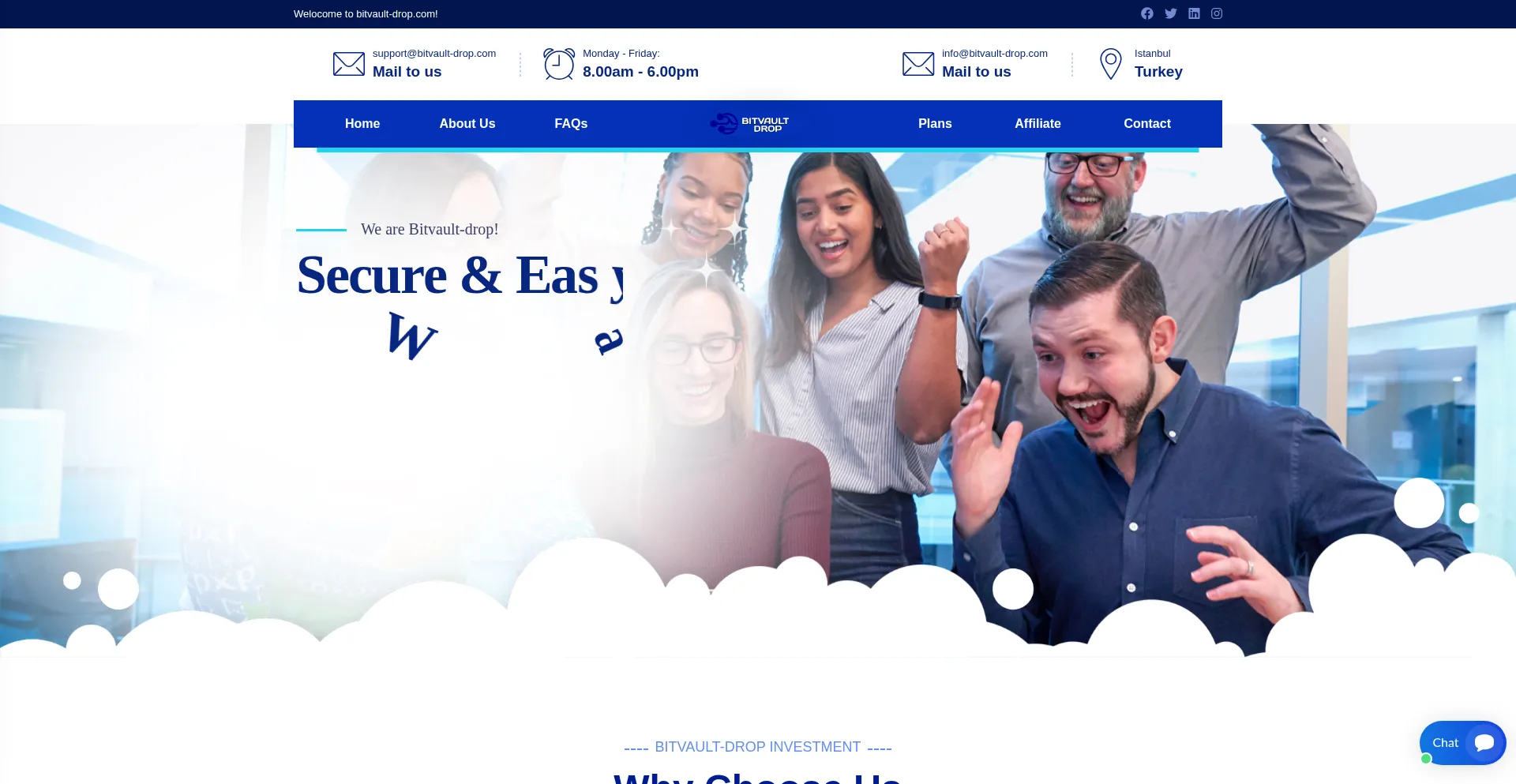 Analysis reveals that bitvault-drop.com displays social media icons or links that do not connect to legitimate social media profiles. This deceptive practice is commonly employed to create false legitimacy and represents a significant indicator of fraudulent intent requiring immediate caution.