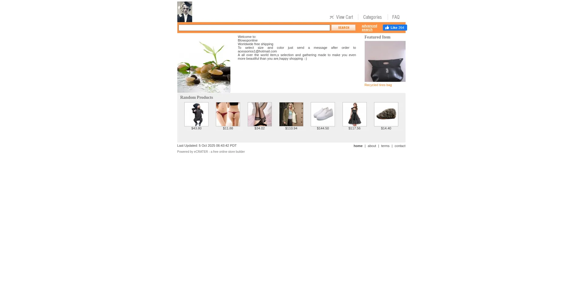Analysis indicates that blowuponline.ecrater.com operates as an e-commerce platform facilitating online transactions for goods or services. The website implements shopping cart functionality, payment processing systems, and product catalog features typical of commercial retail operations.