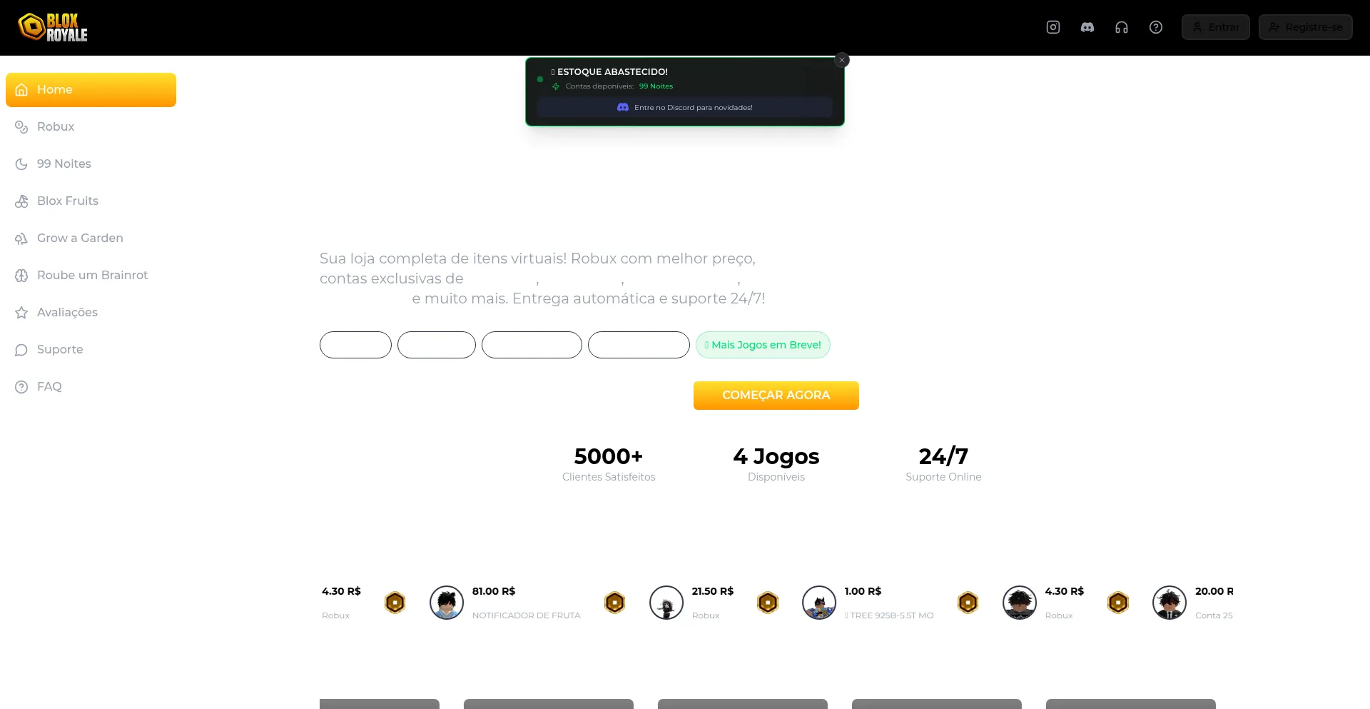 Blox Royale é a loja líder em Robux barato, contas Blox Fruits, GamePass e itens Roblox. Entrega automática, pagamento via PIX, preços imbatíveis e suporte 24/7.