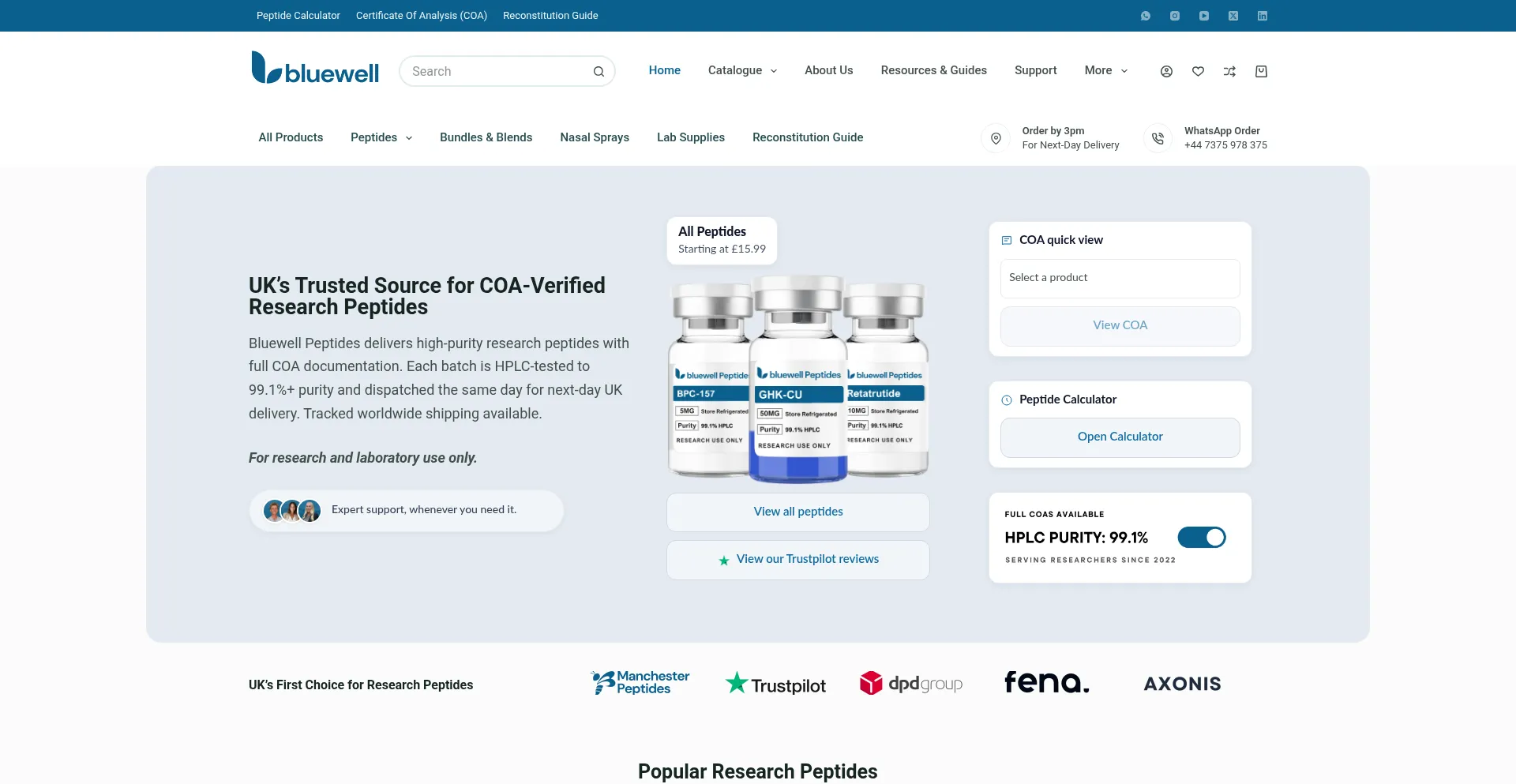 Bluewell Peptides is the UK’s trusted source for COA-verified research peptides. Each batch is HPLC-tested to 99.1% purity with next-day delivery.