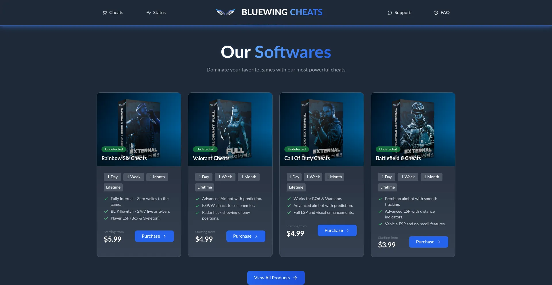 Best Valorant cheats, top Battlefield 6 cheats, premium R6 cheats, undetected COD cheats, upcoming BO7 cheats, and professional HWID spoofer services. Free trials, cheap gaming ...