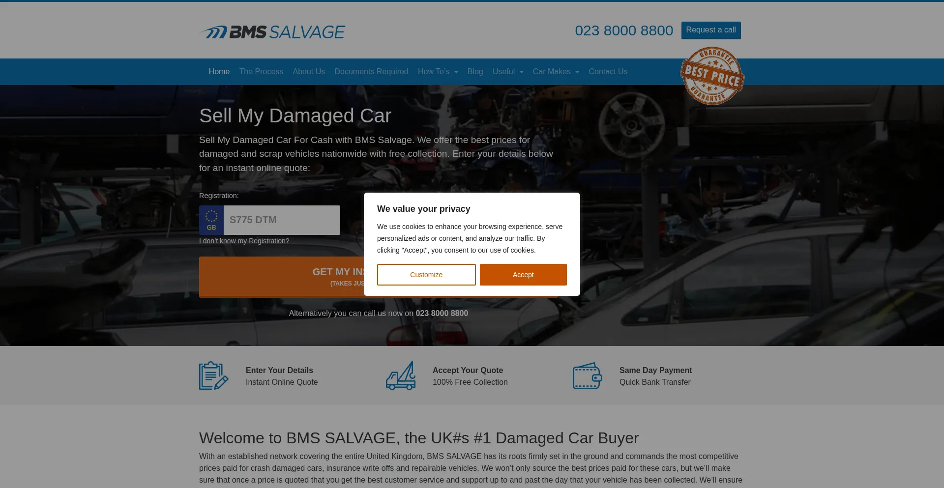 The website implements cookie consent mechanisms in compliance with privacy regulations such as GDPR or CCPA. This demonstrates that bmssalvage.co.uk adheres to data protection standards and provides users with control over personal data collection practices.