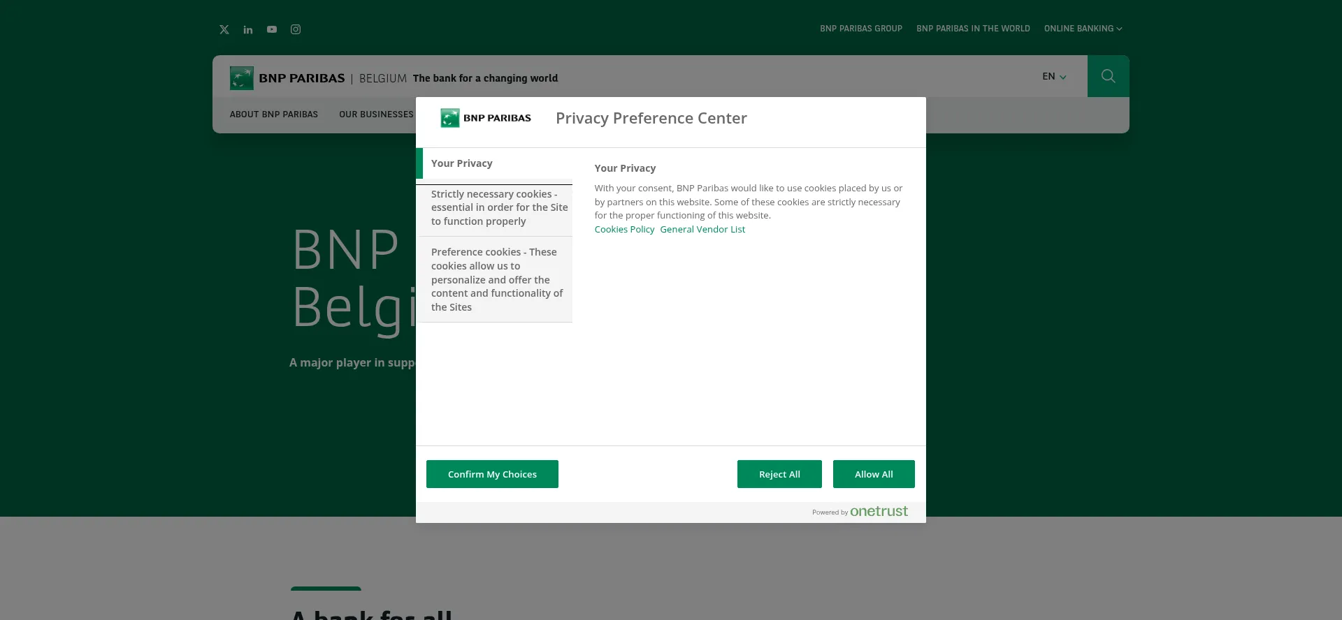 The website implements cookie consent mechanisms in compliance with privacy regulations such as GDPR or CCPA. This demonstrates that bnpparibas.be adheres to data protection standards and provides users with control over personal data collection practices.