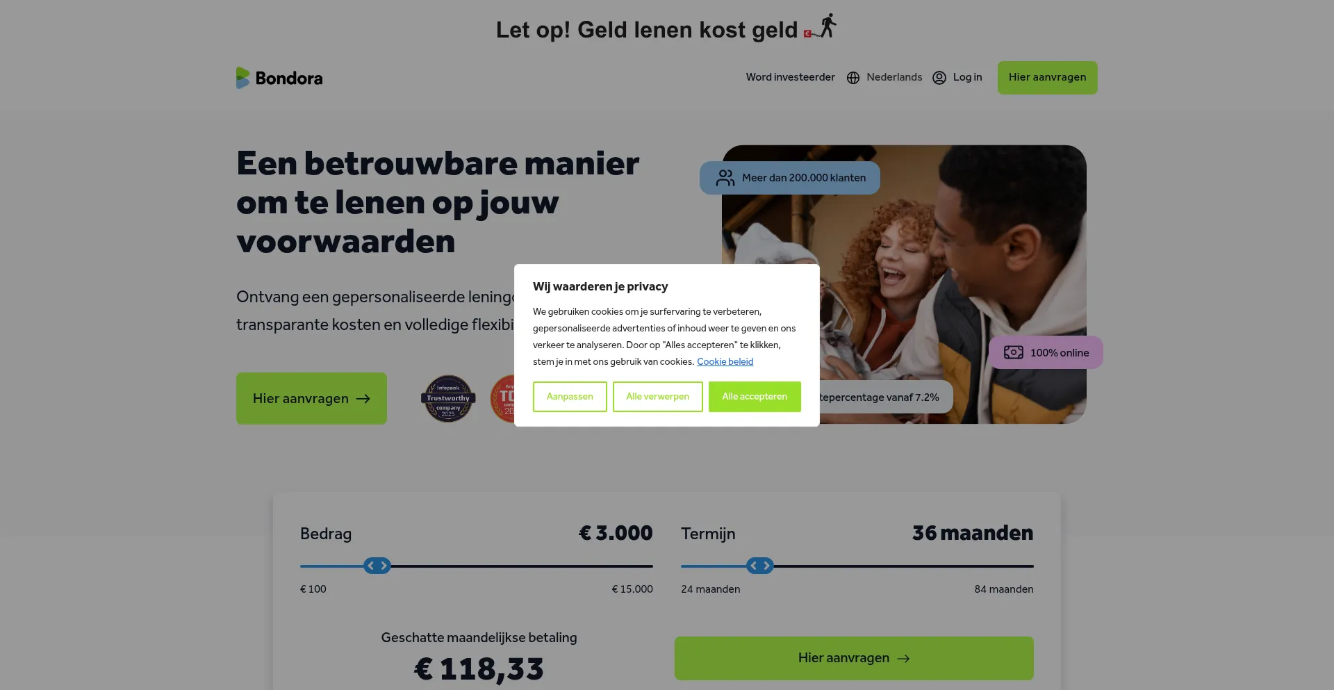 The website implements cookie consent mechanisms in compliance with privacy regulations such as GDPR or CCPA. This demonstrates that bondora.nl adheres to data protection standards and provides users with control over personal data collection practices.