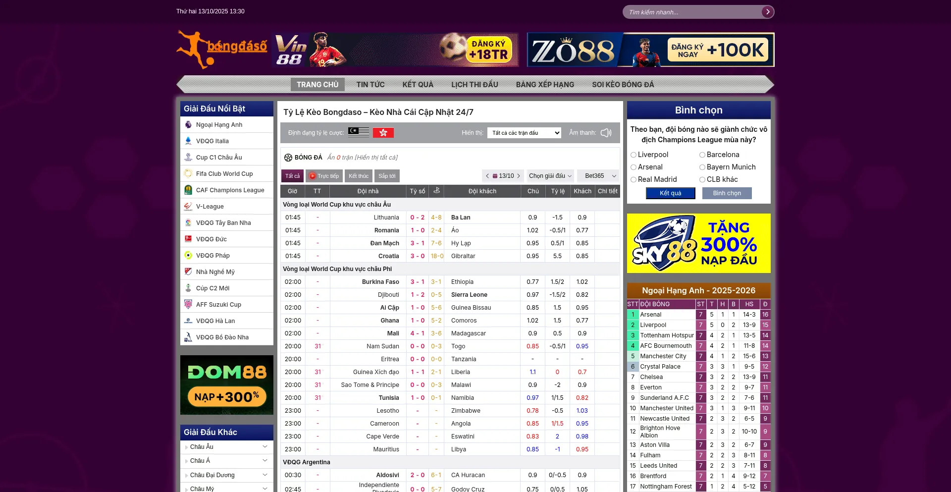 Tỷ Lệ Bóng Đá Live Score, Tỷ Lệ Nhà Cái Hôm Nay - Bongdaso
