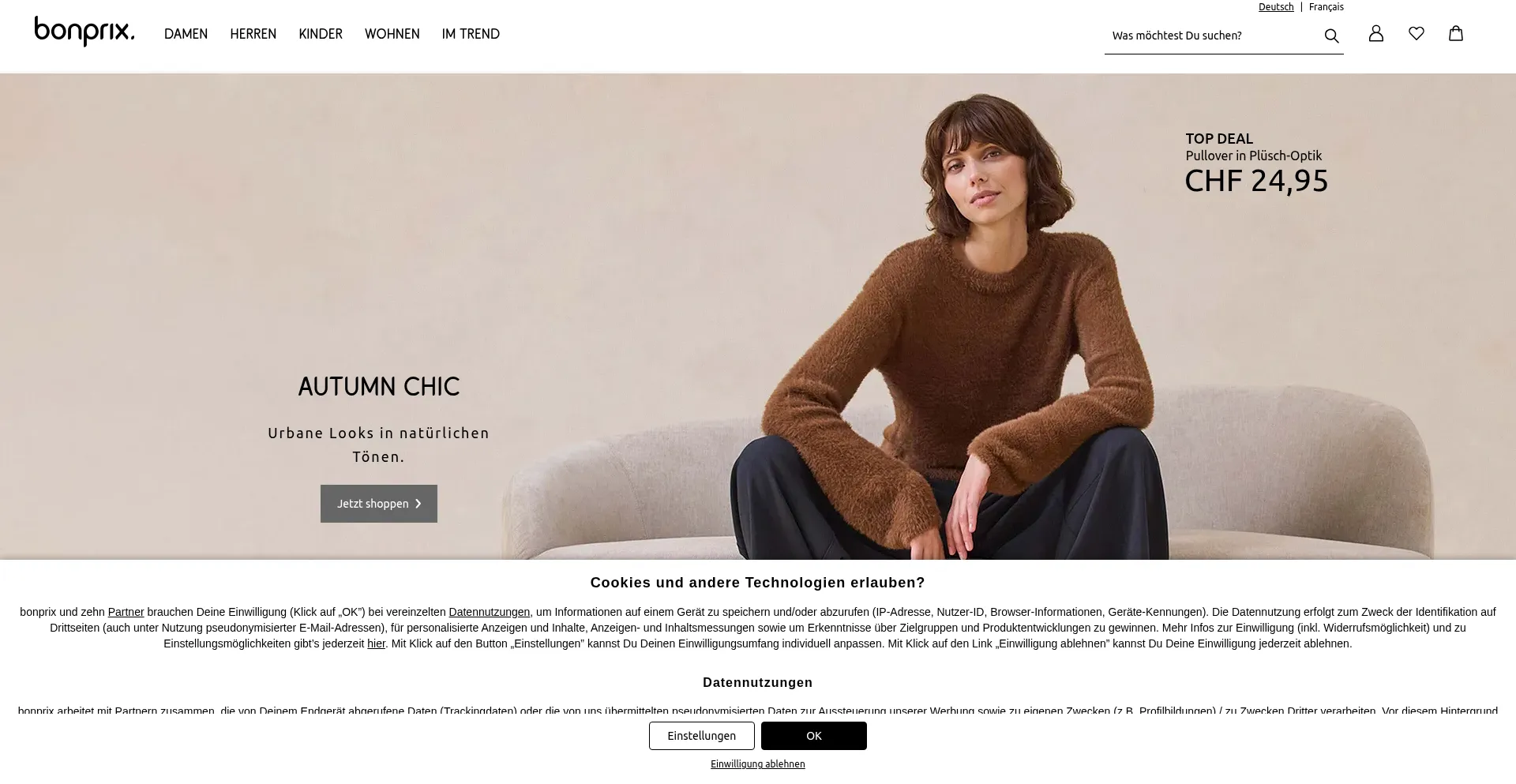 Analysis indicates that bonprix.ch operates as an e-commerce platform facilitating online transactions for goods or services. The website implements shopping cart functionality, payment processing systems, and product catalog features typical of commercial retail operations.